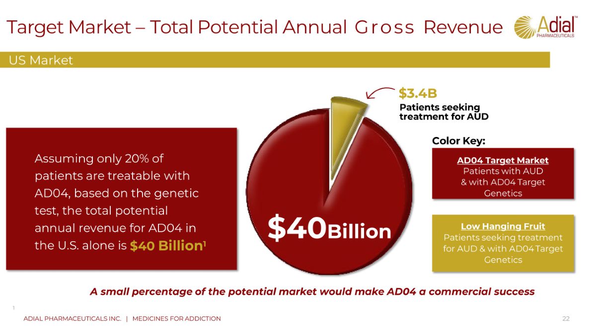 Partner Status 21 • Advancing discussions with potential strategic partners that could fund: • Phase 3 clinical program • Commercialization of AD04 assuming a successful regulatory outcome • Primary Targets - companies with commercial capabilities or pipeline development capabilities in: Alcohol Therapeutics, Addiction, Psychiatry, Neurology, and niche Orphan CNS • Secondary Targets - companies focused on DTP (Direct to Patient) and DTC (Direct to Consumer) Health Platforms • Fully integrated capabilities with telemedicine, behavioral health, genetic screening, and product fulfillment • Direct to patients with obesity, anxiety, depression, obesity and other mental health diagnosis. • Tertiary Targets - companies with a commercial focus where excessive alcohol consumption may be the primary cause of downstream health effects such as hypertension, obesity, alcohol induced steatohepatitis, and other comorbidities. • Currently in discussions under CDA with several companies that have expressed interest in both the U.S. and European markets and are currently reviewing data and regulatory feedback received ADIAL PHARMACEUTICALS INC. | MEDICINES FOR ADDICTION Discussions with potential partners progressing
