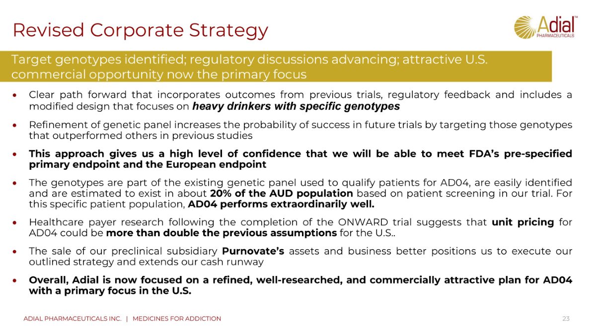 Revised Corporate Strategy 23 ADIAL PHARMACEUTICALS INC. | MEDICINES FOR ADDICTION Target genotypes identified; regulatory discussions advancing; attractive U.S. commercial opportunity now the primary focus Clear path forward that incorporates outcomes from previous trials, regulatory feedback and includes a modified design that focuses on heavy drinkers with specific genotypes Refinement of genetic panel increases the probability of success in future trials by targeting those genotypes that outperformed others in previous studies This approach gives us a high level of confidence that we will be able to meet FDA’s pre - specified primary endpoint and the European endpoint The genotypes are part of the existing genetic panel used to qualify patients for AD 04 , are easily identified and are estimated to exist in about 20 % of the AUD population based on patient screening in our trial . For this specific patient population, AD 04 performs extraordinarily well . Healthcare payer research following the completion of the ONWARD trial suggests that unit pricing for AD 04 could be more than double the previous assumptions for the U . S .. The sale of our preclinical subsidiary Purnovate’s assets and business better positions us to execute our outlined strategy and extends our cash runway Overall, Adial is now focused on a refined, well - researched, and commercially attractive plan for AD 04 with a primary focus in the U . S .