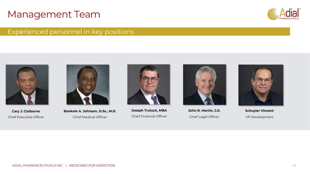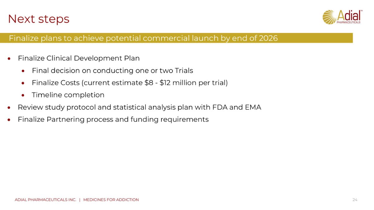 Next steps 24 ADIAL PHARMACEUTICALS INC. | MEDICINES FOR ADDICTION Finalize plans to achieve potential commercial launch by end of 2026 Finalize Clinical Development Plan Final decision on conducting one or two Trials Finalize Costs (current estimate $ 8 - $ 12 million per trial) Timeline completion Review study protocol and statistical analysis plan with FDA and EMA Finalize Partnering process and funding requirements