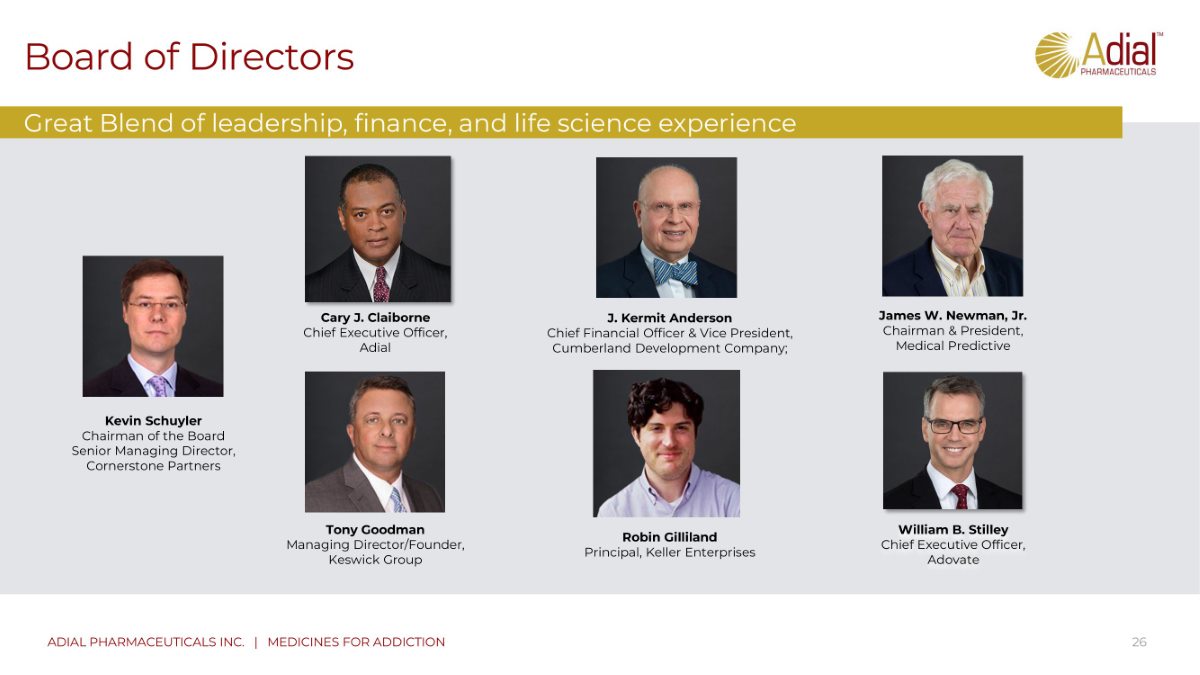 Management Team Joseph Truluck , MBA C hief F inancial O fficer Bankole A. Johnson, D.Sc., M.D. C hief Medical Officer Cary J. Claiborne Chief Executive Officer 25 ADIAL PHARMACEUTICALS INC. | MEDICINES FOR ADDICTION Experienced personnel in key positions John R. Martin, J.D. Chief Legal Officer Schuyler Vinzant VP Development