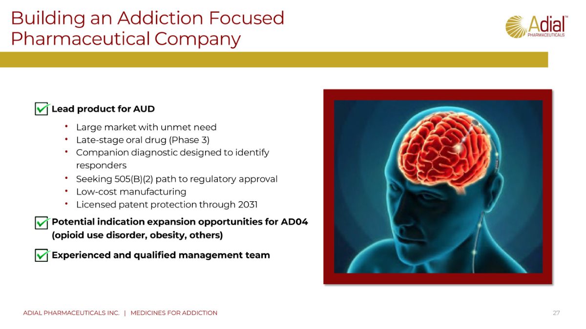 Board of Directors 26 ADIAL PHARMACEUTICALS INC. | MEDICINES FOR ADDICTION Great Blend of leadership, finance, and life science experience Tony Goodman Managing Director/Founder, Keswick Group Cary J. Claiborne Chief Executive Officer, Adial Kevin Schuyler Chairman of the Board Senior Managing Director, Cornerstone Partners J. Kermit Anderson Chief Financial Officer & Vice President, Cumberland Development Company; Robin Gilliland Principal, Keller Enterprises James W. Newman, Jr. Chairman & President, Medical Predictive William B. Stilley Chief Executive Officer, Adovate