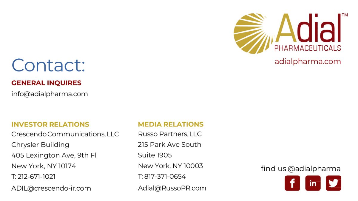 C o n t a c t : GENERAL INQUIRES info@adialpharma.com INVESTOR RELATIONS Crescendo Communications, LLC Chrysler Building 405 Lexington Ave, 9th Fl New York, NY 10174 T: 212 - 671 - 1021 ADIL@crescendo - ir.com find us @adialpharma adialpharma.com MEDIA RELATIONS Russo Partners , LLC 215 Park Ave South Suite 1905 New York, NY 1000 3 T: 817 - 371 - 0654 Adial@RussoPR.com