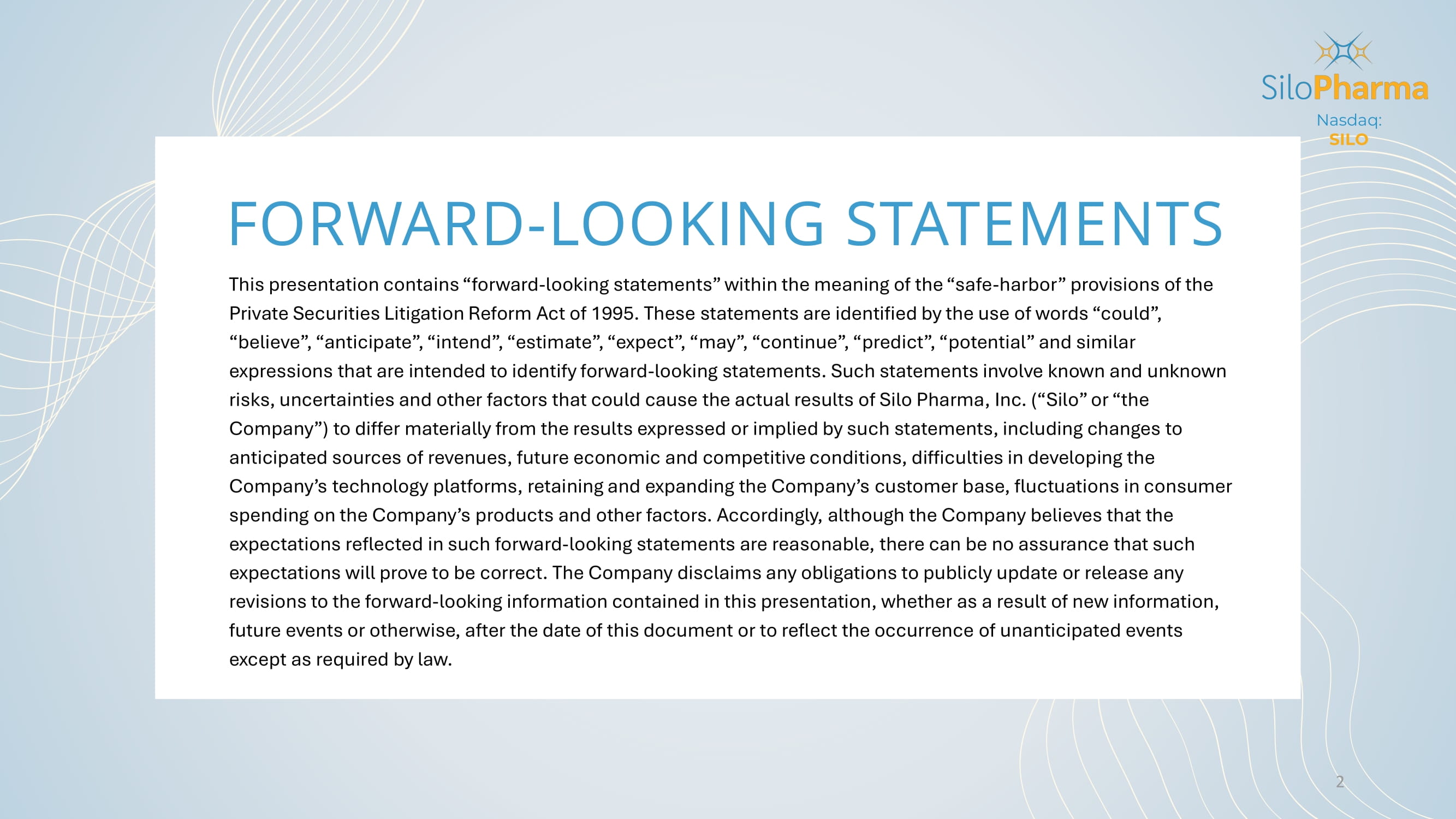 FORWARD - LOOKING STATEMENTS This presentation contains “forward - looking statements” within the meaning of the “safe - harbor” provisions of the Private Securities Litigation Reform Act of 1995. These statements are identified by the use of words “could”, “believe”, “anticipate”, “intend”, “estimate”, “expect”, “may”, “continue”, “predict”, “potential” and similar expressions that are intended to identify forward - looking statements. Such statements involve known and unknown risks, uncertainties and other factors that could cause the actual results of Silo Pharma, Inc. (“Silo” or “the Company”) to differ materially from the results expressed or implied by such statements, including changes to anticipated sources of revenues, future economic and competitive conditions, difficulties in developing the Company’s technology platforms, retaining and expanding the Company’s customer base, fluctuations in consumer spending on the Company’s products and other factors. Accordingly, although the Company believes that the expectations reflected in such forward - looking statements are reasonable, there can be no assurance that such expectations will prove to be correct. The Company disclaims any obligations to publicly update or release any revisions to the forward - looking information contained in this presentation, whether as a result of new information, future events or otherwise, after the date of this document or to reflect the occurrence of unanticipated events except as required by law. Nasdaq: SILO 2