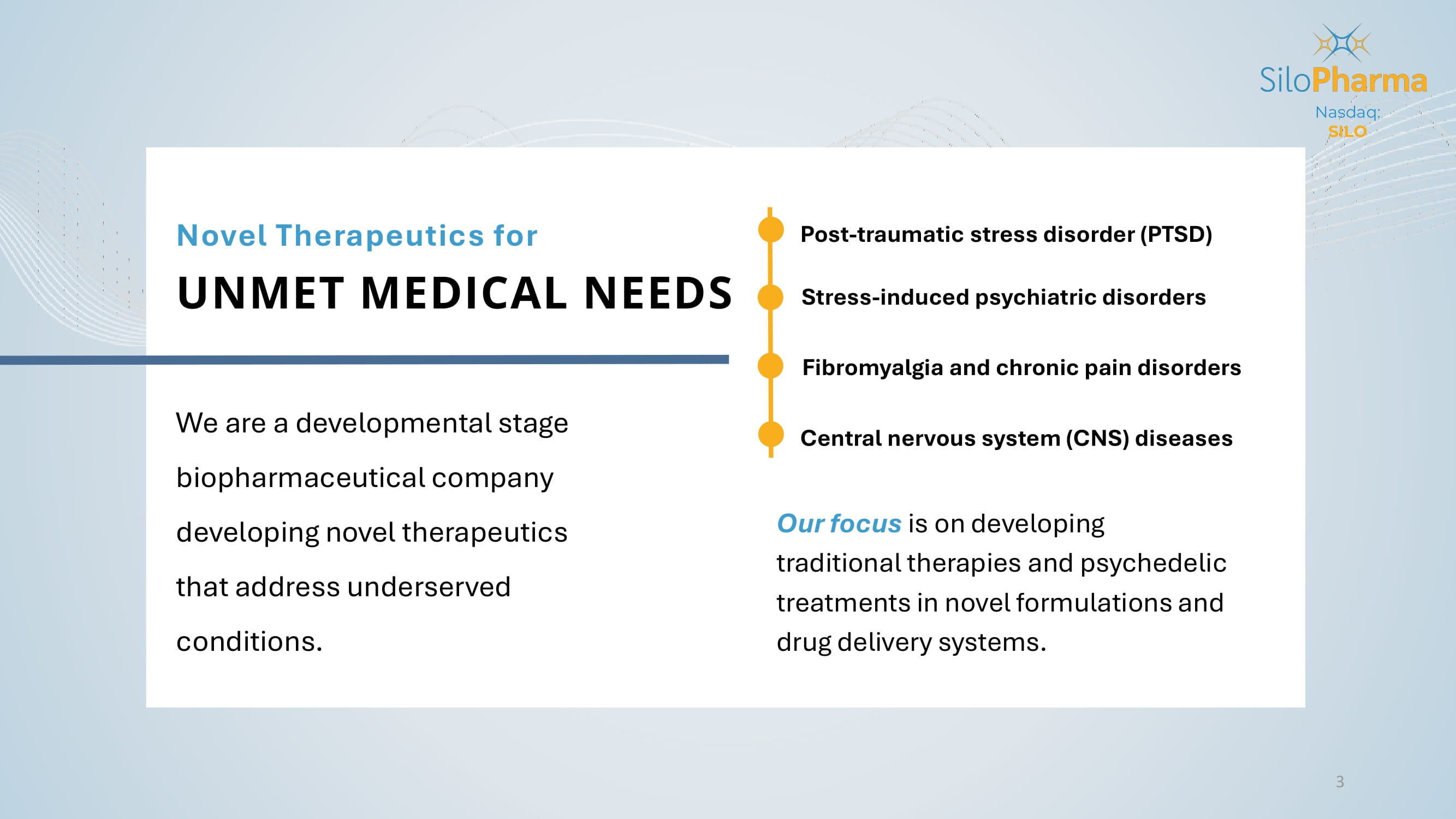 We are a developmental stage biopharmaceutical company developing novel therapeutics that address underserved conditions. UNMET MEDICAL NEEDS Post - traumatic stress disorder (PTSD) Stress - induced psychiatric disorders Fibromyalgia and chronic pain disorders Central nervous system (CNS) diseases Our focus is on developing traditional therapies and psychedelic treatments in novel formulations and drug delivery systems. Novel Therapeutics for Nasdaq: SILO 3