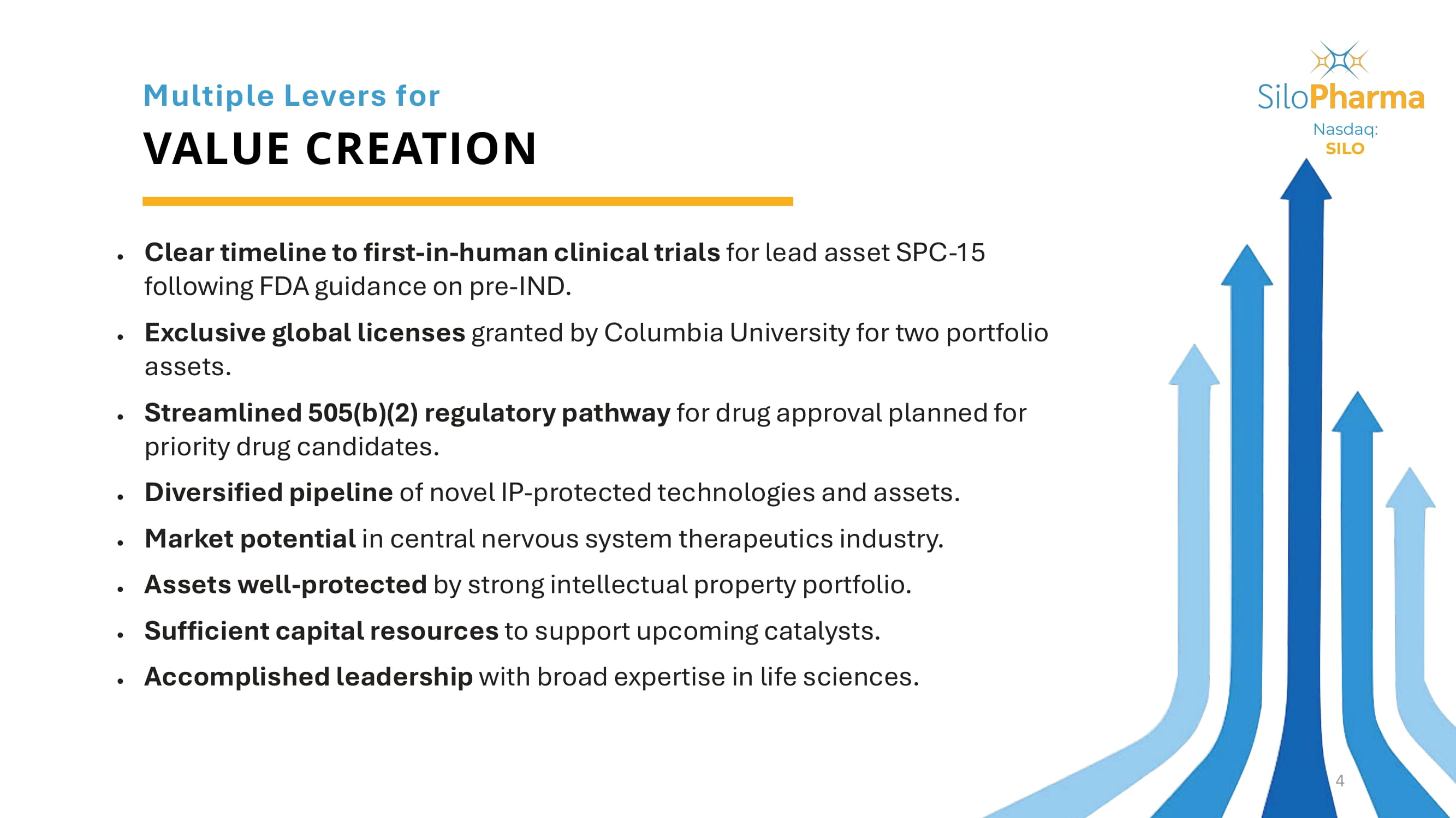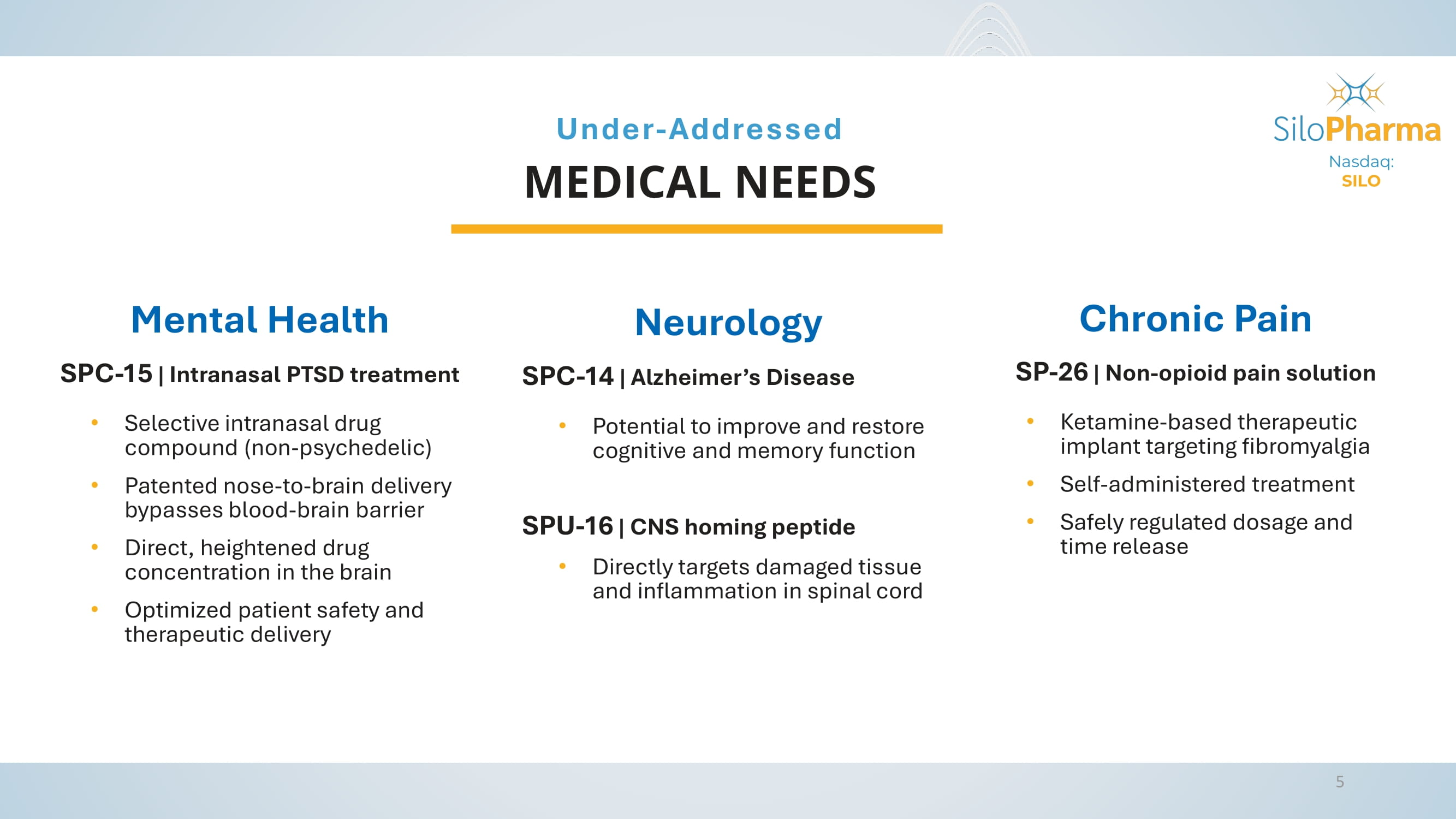 Clear timeline to first - in - human clinical trials for lead asset SPC - 15 following FDA guidance on pre - IND. Exclusive global licenses granted by Columbia University for two portfolio assets. Streamlined 505(b)(2) regulatory pathway for drug approval planned for priority drug candidates. Diversified pipeline of novel IP - protected technologies and assets. Market potential in central nervous system therapeutics industry. Assets well - protected by strong intellectual property portfolio. Sufficient capital resources to support upcoming catalysts. Accomplished leadership with broad expertise in life sciences. Multiple Levers for VALUE CREATION Nasdaq: SILO 4