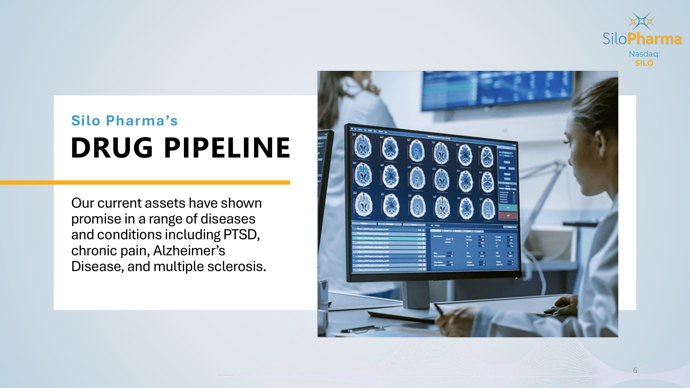 DRUG PIPELINE Our current assets have shown promise in a range of diseases and conditions including PTSD, chronic pain, Alzheimer’s Disease, and multiple sclerosis. Silo Pharma’s Nasdaq: SILO 6