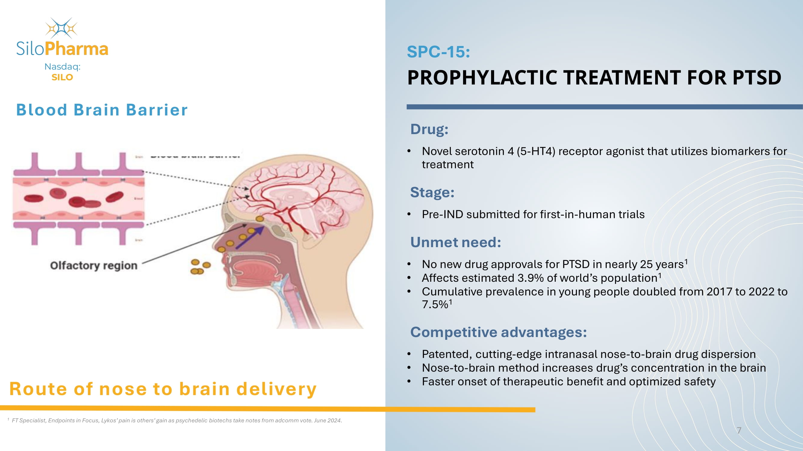 INTRODUCTION Lorem ipsum dolor sit amet, consectetur adipiscing elit, eiusmod tempor incididunt ut labore et dolore magna Ut enim ad minim veniam, quis nostrud exercitation laboris nisi ut aliquip ex ea commodo consequat. Duis aute irure dolor in reprehenderit in voluptate velit esse cillum dolore eu fugiat nulla pariatur. Excepteur sint occaecat cupidatat non proident, sunt in culpa qui officia deserunt mollit anim id est laborum. Route of nose to brain delivery SPC - 15 : PROPHYLACTIC TREATMENT FOR PTSD Drug: • Novel serotonin 4 (5 - HT4) receptor agonist that utilizes biomarkers for treatment Stage: • Pre - IND submitted for first - in - human trials Unmet need: • No new drug approvals for PTSD in nearly 25 years 1 • Affects estimated 3.9% of world’s population 1 • Cumulative prevalence in young people doubled from 2017 to 2022 to 7.5% 1 Competitive advantages: • Patented, cutting - edge intranasal nose - to - brain drug dispersion • Nose - to - brain method increases drug’s concentration in the brain • Faster onset of therapeutic benefit and optimized safety Blood Brain Barrier Nasdaq: SILO 1 FT Specialist, Endpoints in Focus, Lykos ’ pain is others’ gain as psychedelic biotechs take notes from adcomm vote. June 2024. 7