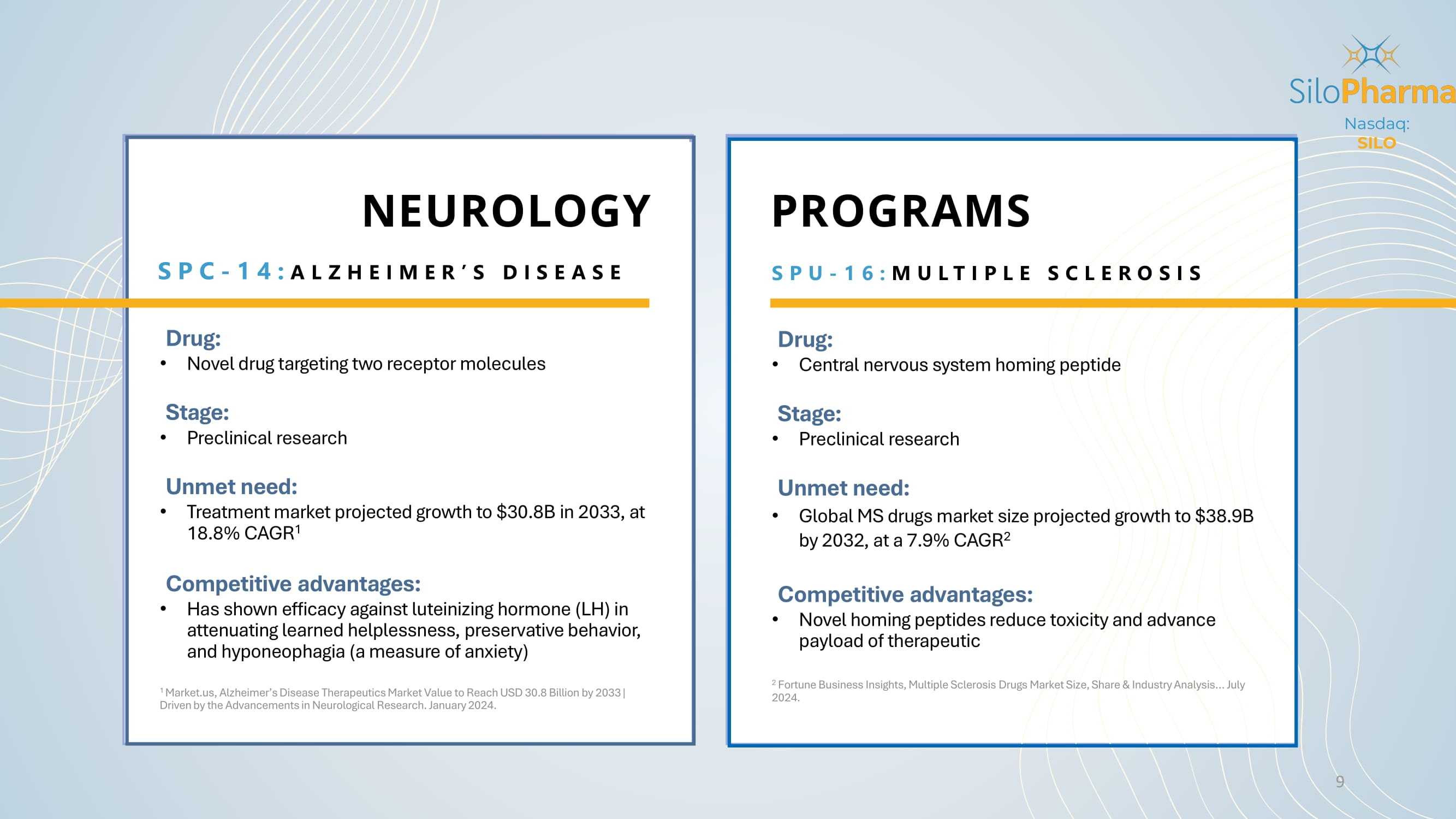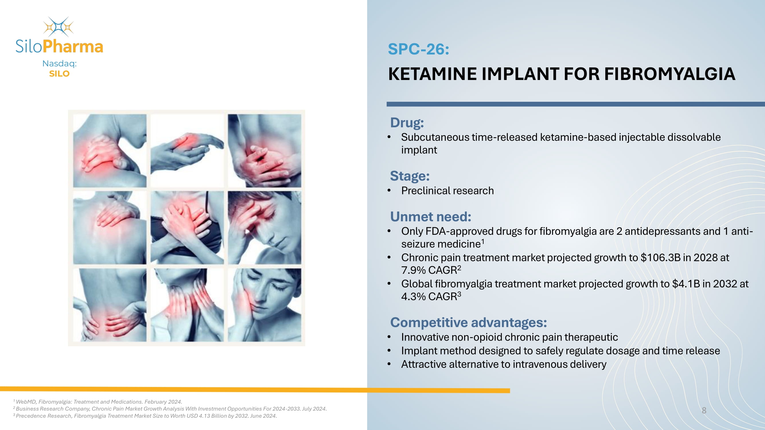 Drug: • Subcutaneous time - released ketamine - based injectable dissolvable implant Stage: • Preclinical research Unmet need: • Only FDA - approved drugs for fibromyalgia are 2 antidepressants and 1 anti - seizure medicine 1 • Chronic pain treatment market projected growth to $106.3B in 2028 at 7.9% CAGR 2 • Global fibromyalgia treatment market projected growth to $4.1B in 2032 at 4.3% CAGR 3 Competitive advantages: • Innovative non - opioid chronic pain therapeutic • Implant method designed to safely regulate dosage and time release • Attractive alternative to intravenous delivery Nasdaq: SILO SPC - 26 : KETAMINE IMPLANT FOR FIBROMYALGIA 1 WebMD, Fibromyalgia: Treatment and Medications. February 2024. 2 Business Research Company, Chronic Pain Market Growth Analysis With Investment Opportunities For 2024 - 2033. July 2024. 3 Precedence Research, Fibromyalgia Treatment Market Size to Worth USD 4.13 Billion by 2032. June 2024. 8