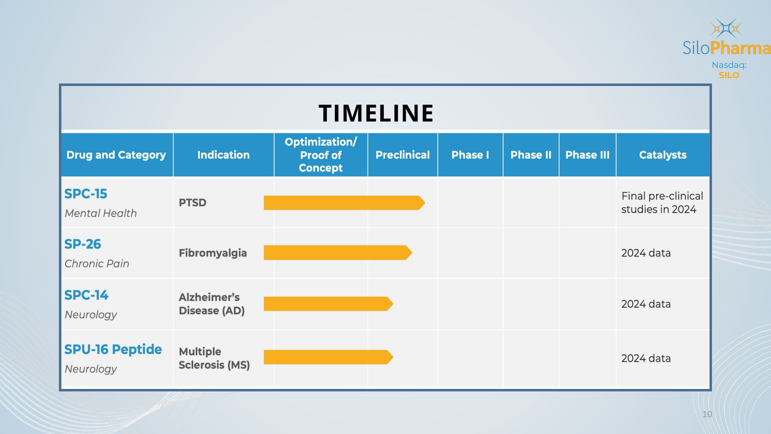 SPC - 14 : ALZHEIMER’S DISEASE PROGRAMS SPU - 16 : MULTIPLE SCLEROSIS NEUROLOGY Drug: • Novel drug targeting two receptor molecules Stage: • Preclinical research Unmet need: • Treatment market projected growth to $30.8B in 2033, at 18.8% CAGR 1 Competitive advantages: • Has shown efficacy against luteinizing hormone (LH) in attenuating learned helplessness, preservative behavior, and hyponeophagia (a measure of anxiety) 1 Market.us , Alzheimer’s Disease Therapeutics Market Value to Reach USD 30.8 Billion by 2033 | Driven by the Advancements in Neurological Research. January 2024. Drug: • Central nervous system homing peptide Stage: • Preclinical research Unmet need: • Global MS drugs market size projected growth to $38.9B by 2032, at a 7.9% CAGR 2 Competitive advantages: • Novel homing peptides reduce toxicity and advance payload of therapeutic 2 Fortune Business Insights, Multiple Sclerosis Drugs Market Size, Share & Industry Analysis… July 2024. Nasdaq: SILO 9