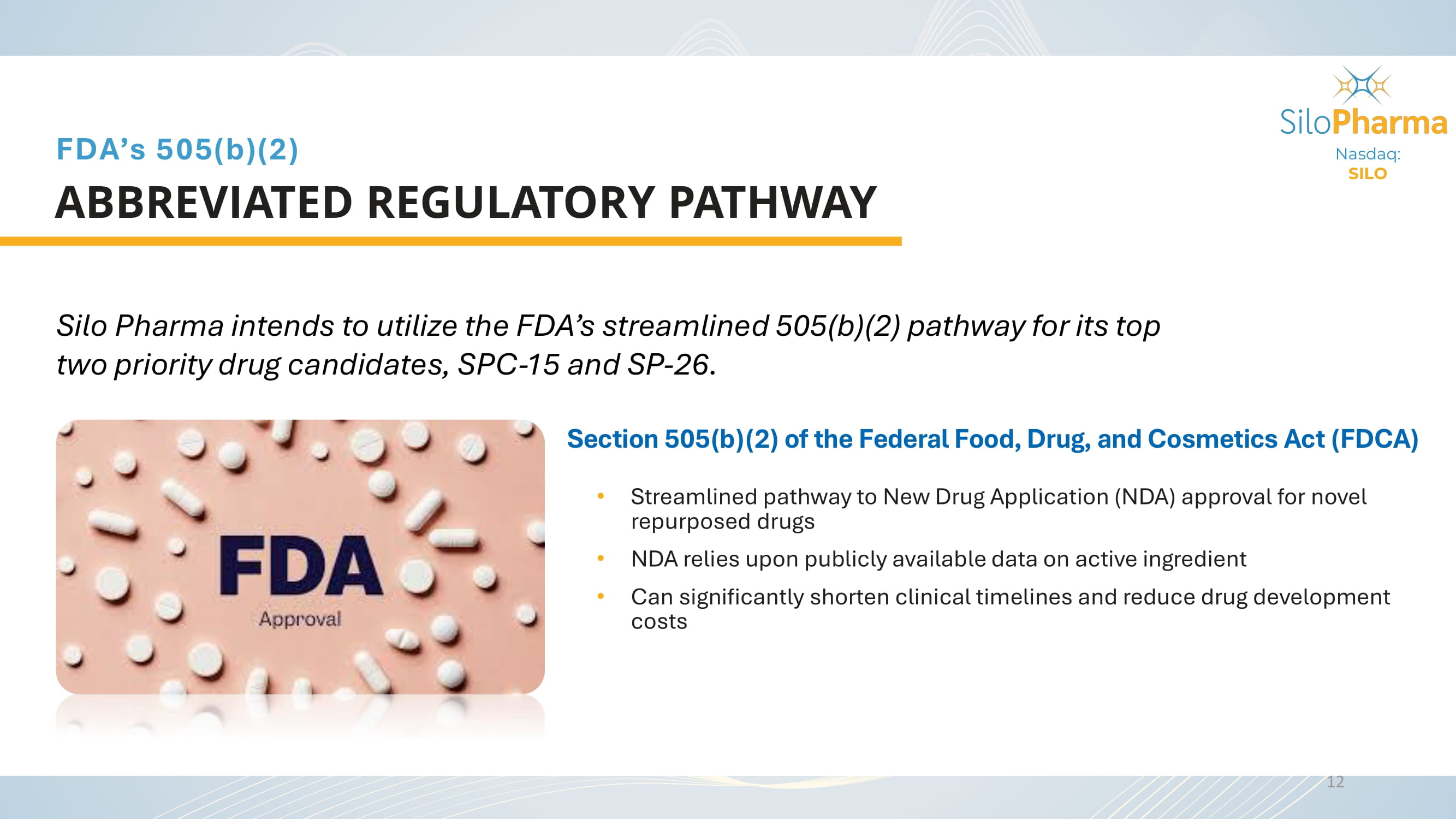 FDA’s 505(b)(2) ABBREVIATED REGULATORY PATHWAY Silo Pharma intends to utilize the FDA’s streamlined 505(b)(2) pathway for its top two priority drug candidates, SPC - 15 and SP - 26. Section 505(b)(2) of the Federal Food, Drug, and Cosmetics Act (FDCA) • Streamlined pathway to New Drug Application (NDA) approval for novel repurposed drugs • NDA relies upon publicly available data on active ingredient • Can significantly shorten clinical timelines and reduce drug development costs Nasdaq: SILO 12