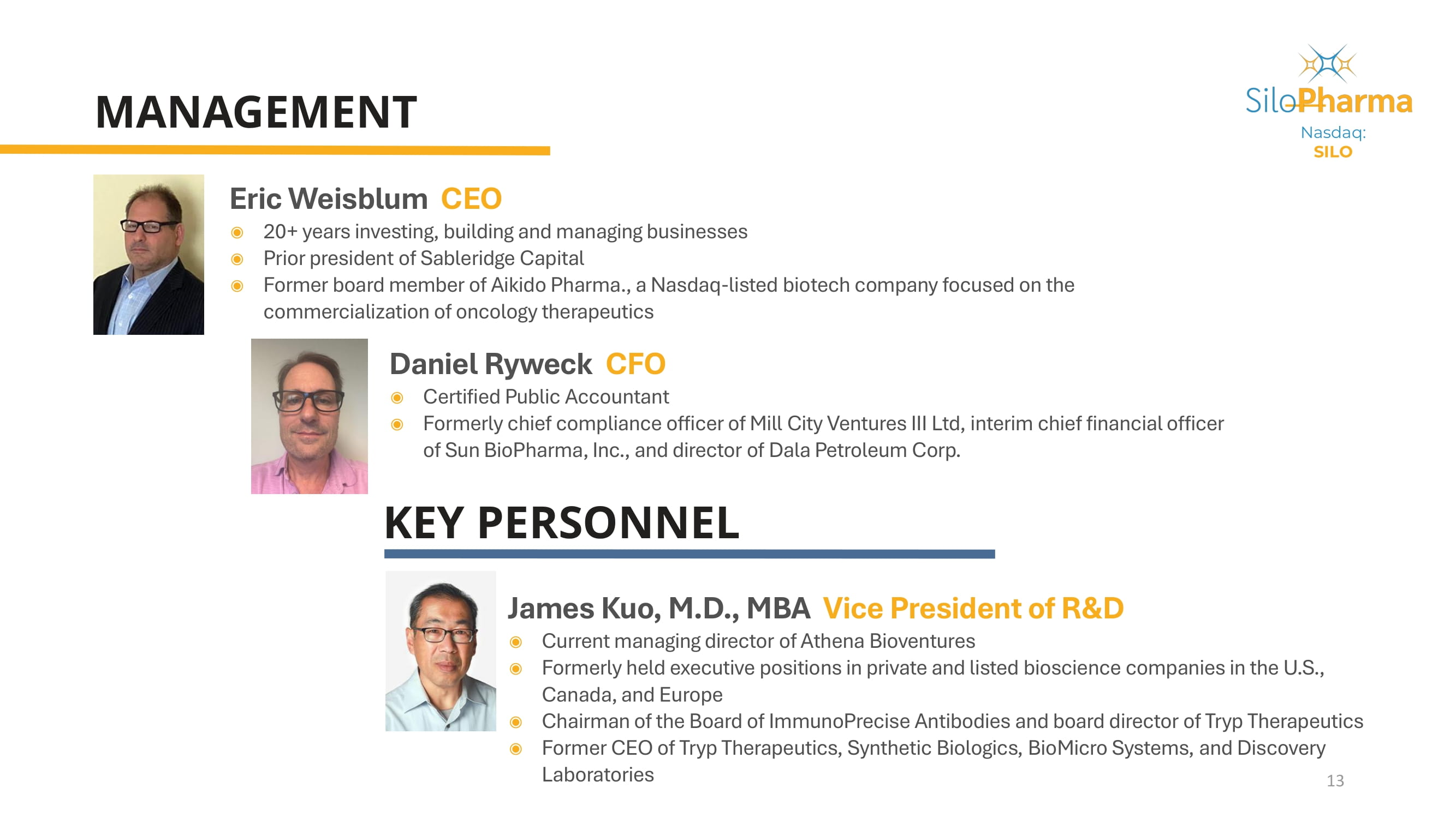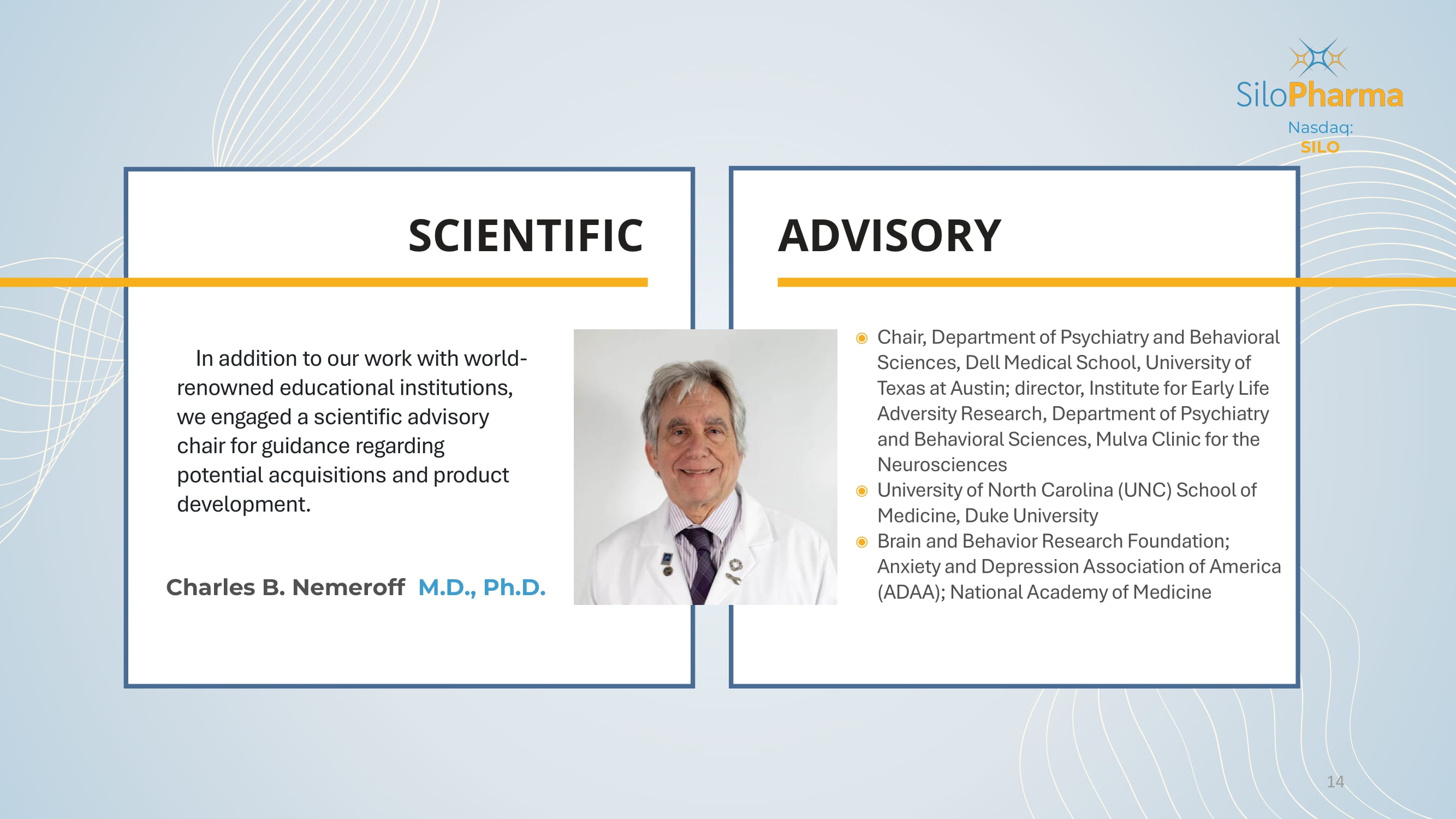 Eric Weisblum CEO ◉ 20+ years investing, building and managing businesses ◉ Prior president of Sableridge Capital ◉ Former board member of Aikido Pharma., a Nasdaq - listed biotech company focused on the commercialization of oncology therapeutics James Kuo, M.D., MBA Vice President of R&D ◉ Current managing director of Athena Bioventures ◉ Formerly held executive positions in private and listed bioscience companies in the U.S., Canada, and Europe ◉ Chairman of the Board of ImmunoPrecise Antibodies and board director of Tryp Therapeutics ◉ Former CEO of Tryp Therapeutics, Synthetic Biologics, BioMicro Systems, and Discovery Laboratories Nasdaq: SILO MANAGEMENT Daniel Ryweck CFO ◉ Certified Public Accountant ◉ Formerly chief compliance officer of Mill City Ventures III Ltd, interim chief financial officer of Sun BioPharma, Inc., and director of Dala Petroleum Corp. KEY PERSONNEL 13