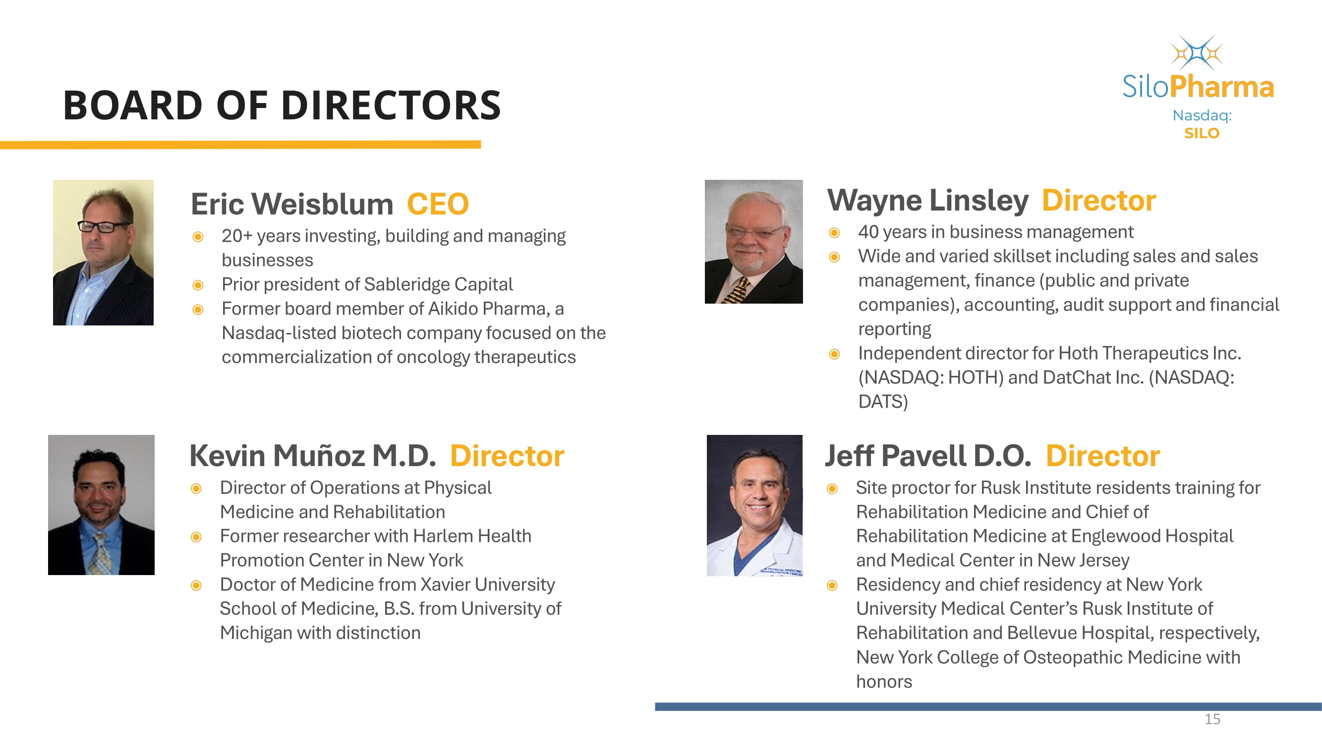 Wayne Linsley Director ◉ 40 years in business management ◉ Wide and varied skillset including sales and sales management, finance (public and private companies), accounting, audit support and financial reporting ◉ Independent director for Hoth Therapeutics Inc. (NASDAQ: HOTH) and DatChat Inc. (NASDAQ: DATS) Kevin Muñoz M.D. Director ◉ Director of Operations at Physical Medicine and Rehabilitation ◉ Former researcher with Harlem Health Promotion Center in New York ◉ Doctor of Medicine from Xavier University School of Medicine, B.S. from University of Michigan with distinction Jeff Pavell D.O. Director ◉ Site proctor for Rusk Institute residents training for Rehabilitation Medicine and Chief of Rehabilitation Medicine at Englewood Hospital and Medical Center in New Jersey ◉ Residency and chief residency at New York University Medical Center’s Rusk Institute of Rehabilitation and Bellevue Hospital, respectively, New York College of Osteopathic Medicine with honors BOARD OF DIRECTORS Nasdaq: SILO 15 Eric Weisblum CEO ◉ 20+ years investing, building and managing businesses ◉ Prior president of Sableridge Capital ◉ Former board member of Aikido Pharma, a Nasdaq - listed biotech company focused on the commercialization of oncology therapeutics