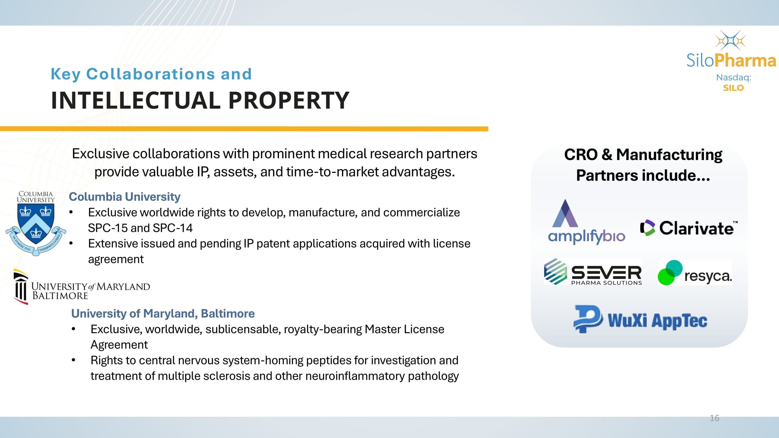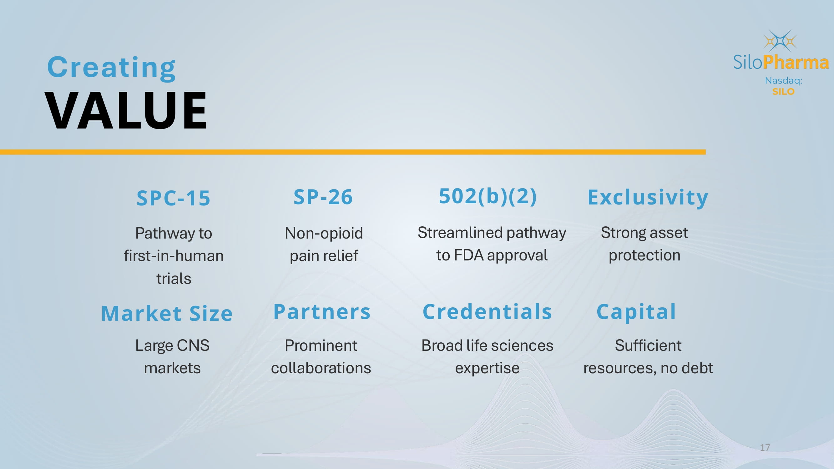 Key Collaborations and Exclusive collaborations with prominent medical research partners provide valuable IP, assets, and time - to - market advantages. INTELLECTUAL PROPERTY Columbia University • Exclusive worldwide rights to develop, manufacture, and commercialize SPC - 15 and SPC - 14 • Extensive issued and pending IP patent applications acquired with license agreement CRO & Manufacturing Partners include… University of Maryland, Baltimore • Exclusive, worldwide, sublicensable, royalty - bearing Master License Agreement • Rights to central nervous system - homing peptides for investigation and treatment of multiple sclerosis and other neuroinflammatory pathology Nasdaq: SILO 16