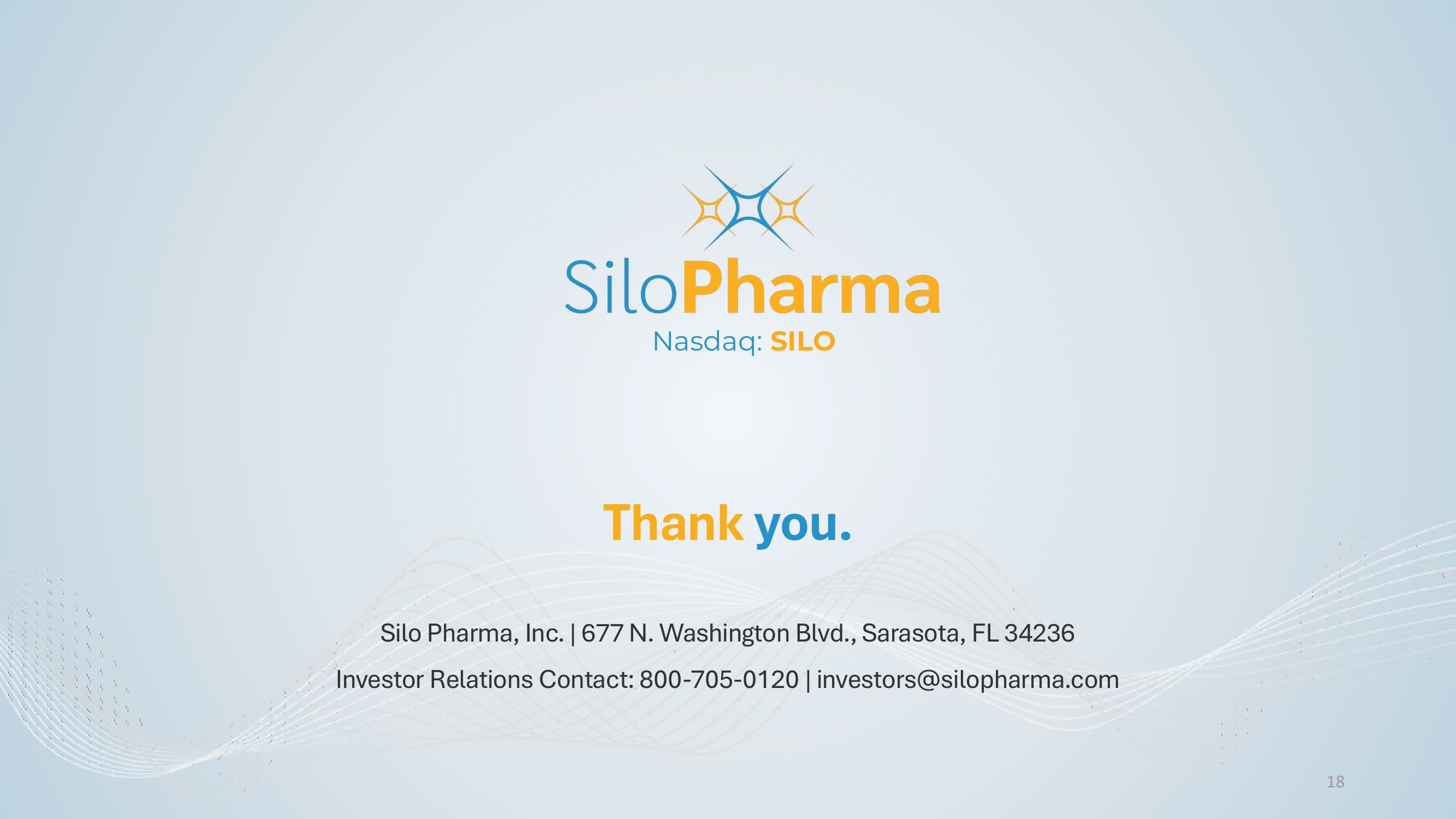 Nasdaq: SILO Thank you. Silo Pharma, Inc. | 677 N. Washington Blvd., Sarasota, FL 34236 Investor Relations Contact: 800 - 705 - 0120 | investors@silopharma.com 18