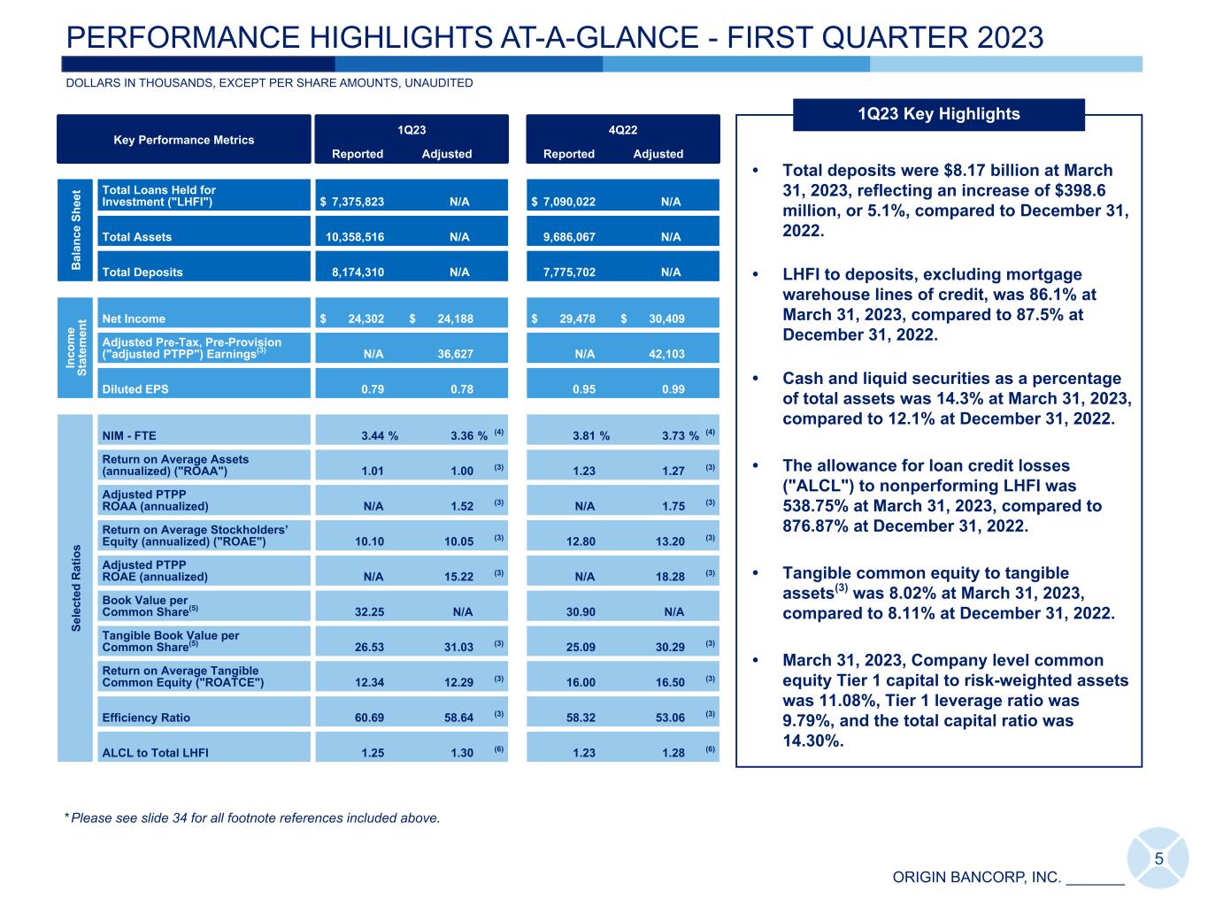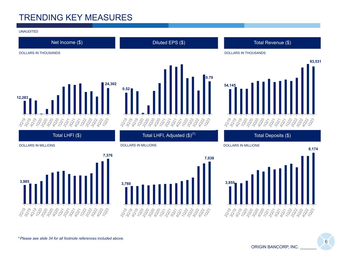 ORIGIN BANCORP, INC. _______ • Total deposits were $8.17 billion at March 31, 2023, reflecting an increase of $398.6 million, or 5.1%, compared to December 31, 2022. • LHFI to deposits, excluding mortgage warehouse lines of credit, was 86.1% at March 31, 2023, compared to 87.5% at December 31, 2022. • Cash and liquid securities as a percentage of total assets was 14.3% at March 31, 2023, compared to 12.1% at December 31, 2022. • The allowance for loan credit losses ("ALCL") to nonperforming LHFI was 538.75% at March 31, 2023, compared to 876.87% at December 31, 2022. • Tangible common equity to tangible assets(3) was 8.02% at March 31, 2023, compared to 8.11% at December 31, 2022. • March 31, 2023, Company level common equity Tier 1 capital to risk-weighted assets was 11.08%, Tier 1 leverage ratio was 9.79%, and the total capital ratio was 14.30%. Key Performance Metrics 1Q23 4Q22 Reported Adjusted Reported Adjusted B al an ce S he et Total Loans Held for Investment ("LHFI") $ 7,375,823 N/A $ 7,090,022 N/A Total Assets 10,358,516 N/A 9,686,067 N/A Total Deposits 8,174,310 N/A 7,775,702 N/A In co m e St at em en t Net Income $ 24,302 $ 24,188 $ 29,478 $ 30,409 Adjusted Pre-Tax, Pre-Provision ("adjusted PTPP") Earnings(3) N/A 36,627 N/A 42,103 Diluted EPS 0.79 0.78 0.95 0.99 Se le ct ed R at io s NIM - FTE 3.44 % 3.36 % (4) 3.81 % 3.73 % (4) Return on Average Assets (annualized) ("ROAA") 1.01 1.00 (3) 1.23 1.27 (3) Adjusted PTPP ROAA (annualized) N/A 1.52 (3) N/A 1.75 (3) Return on Average Stockholders’ Equity (annualized) ("ROAE") 10.10 10.05 (3) 12.80 13.20 (3) Adjusted PTPP ROAE (annualized) N/A 15.22 (3) N/A 18.28 (3) Book Value per Common Share(5) 32.25 N/A 30.90 N/A Tangible Book Value per Common Share(5) 26.53 31.03 (3) 25.09 30.29 (3) Return on Average Tangible Common Equity ("ROATCE") 12.34 12.29 (3) 16.00 16.50 (3) Efficiency Ratio 60.69 58.64 (3) 58.32 53.06 (3) ALCL to Total LHFI 1.25 1.30 (6) 1.23 1.28 (6) DOLLARS IN THOUSANDS, EXCEPT PER SHARE AMOUNTS, UNAUDITED 5 PERFORMANCE HIGHLIGHTS AT-A-GLANCE - FIRST QUARTER 2023 1Q23 Key Highlights * Please see slide 34 for all footnote references included above.
