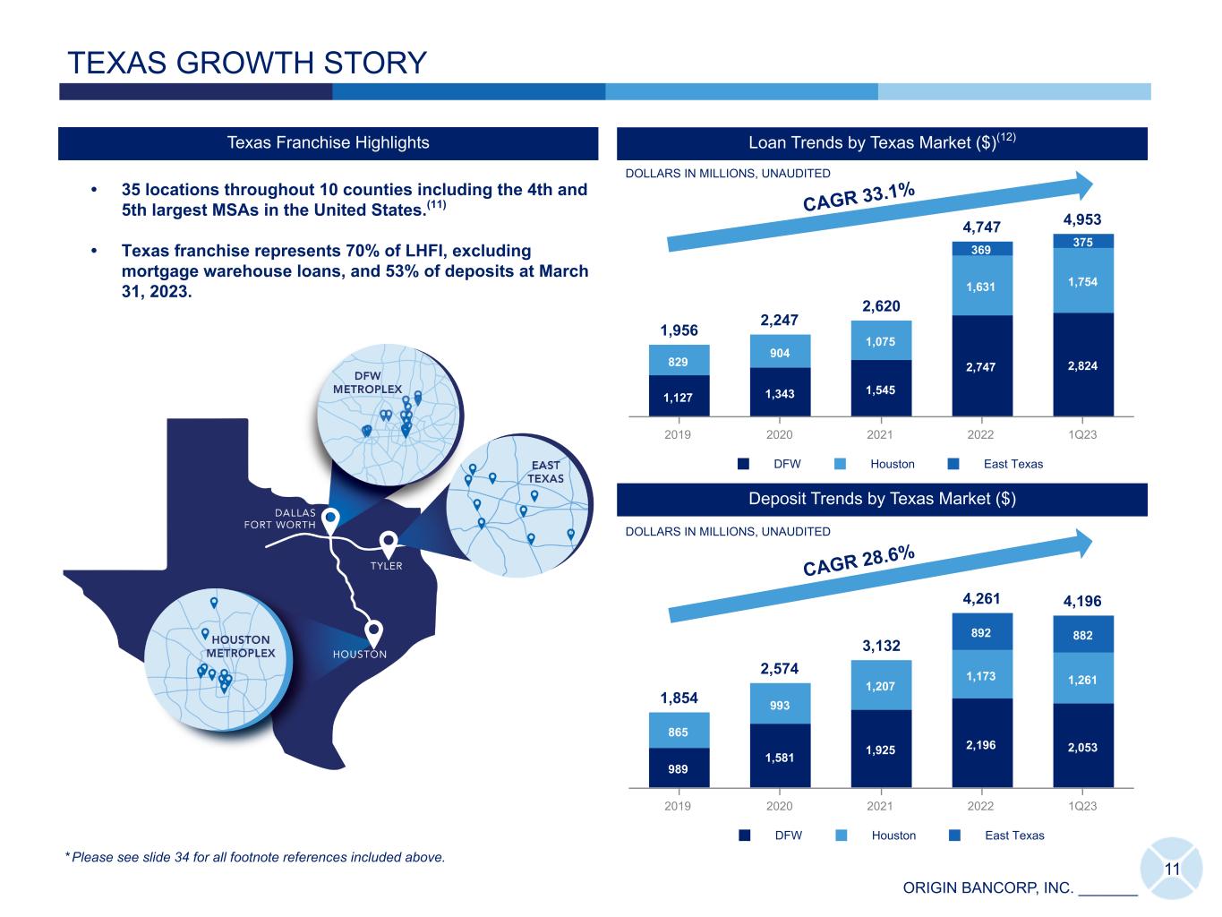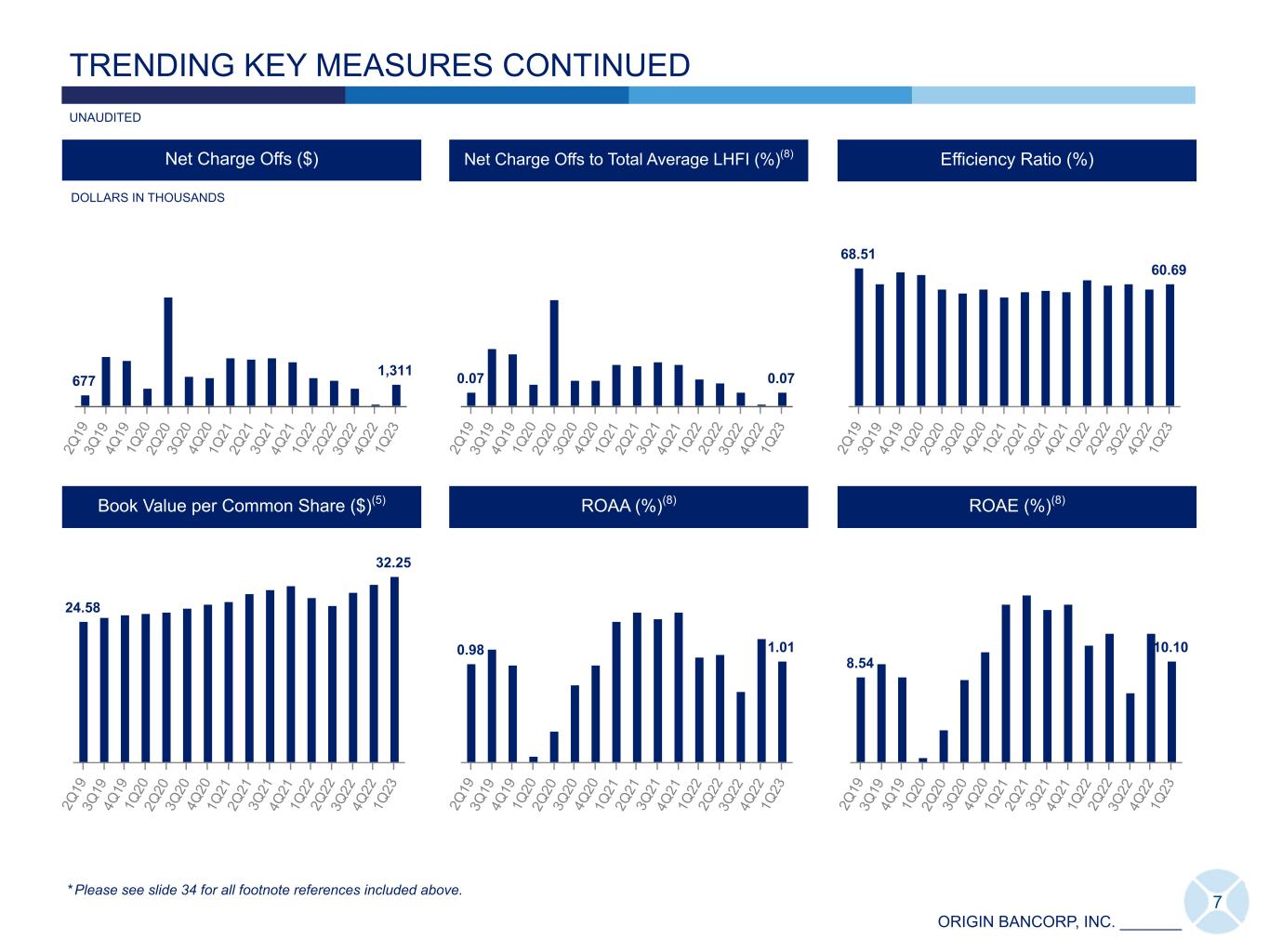 ORIGIN BANCORP, INC. _______ TRENDING KEY MEASURES 54,145 2Q 19 3Q 19 4Q 19 1Q 20 2Q 20 3Q 20 4Q 20 1Q 21 2Q 21 3Q 21 4Q 21 1Q 22 2Q 22 3Q 22 4Q 22 1Q 23 Total Revenue ($) UNAUDITED Diluted EPS ($)Net Income ($) Total LHFI, Adjusted ($)(7) Total Deposits ($) 0.52 0.79 2Q 19 3Q 19 4Q 19 1Q 20 2Q 20 3Q 20 4Q 20 1Q 21 2Q 21 3Q 21 4Q 21 1Q 22 2Q 22 3Q 22 4Q 22 1Q 23 2Q 19 3Q 19 4Q 19 1Q 20 2Q 20 3Q 20 4Q 20 1Q 21 2Q 21 3Q 21 4Q 21 1Q 22 2Q 22 3Q 22 4Q 22 1Q 23 3,855 8,174 2Q 19 3Q 19 4Q 19 1Q 20 2Q 20 3Q 20 4Q 20 1Q 21 2Q 21 3Q 21 4Q 21 1Q 22 2Q 22 3Q 22 4Q 22 1Q 23 3,760 7,038 2Q 19 3Q 19 4Q 19 1Q 20 2Q 20 3Q 20 4Q 20 1Q 21 2Q 21 3Q 21 4Q 21 1Q 22 2Q 22 3Q 22 4Q 22 1Q 23 DOLLARS IN THOUSANDS DOLLARS IN THOUSANDS 6 Total LHFI ($) DOLLARS IN MILLIONS 3,985 7,376 2Q 19 3Q 19 4Q 19 1Q 20 2Q 20 3Q 20 4Q 20 1Q 21 2Q 21 3Q 21 4Q 21 1Q 22 2Q 22 3Q 22 4Q 22 1Q 23 DOLLARS IN MILLIONS 24,302 12,283 93,531 DOLLARS IN MILLIONS * Please see slide 34 for all footnote references included above.