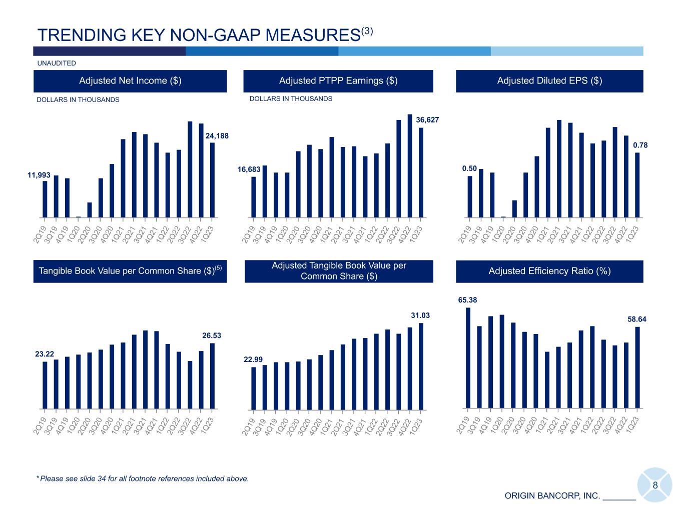ORIGIN BANCORP, INC. _______ TRENDING KEY NON-GAAP MEASURES CONTINUED(3) Adjusted ROAE (%) UNAUDITED, ANNUALIZED Adjusted ROAA (%) Adjusted PTPP ROAA (%) Adjusted PTPP ROAE (%) 9.03 2Q 19 3Q 19 4Q 19 1Q 20 2Q 20 3Q 20 4Q 20 1Q 21 2Q 21 3Q 21 4Q 21 1Q 22 2Q 22 3Q 22 4Q 22 1Q 23 ROATCE (%)(9) 9 8.81 2Q 19 3Q 19 4Q 19 1Q 20 2Q 20 3Q 20 4Q 20 1Q 21 2Q 21 3Q 21 4Q 21 1Q 22 2Q 22 3Q 22 4Q 22 1Q 23 Adjusted ROATCE (%) 1.33 1.52 2Q 19 3Q 19 4Q 19 1Q 20 2Q 20 3Q 20 4Q 20 1Q 21 2Q 21 3Q 21 4Q 21 1Q 22 2Q 22 3Q 22 4Q 22 1Q 23 8.34 2Q 19 3Q 19 4Q 19 1Q 20 2Q 20 3Q 20 4Q 20 1Q 21 2Q 21 3Q 21 4Q 21 1Q 22 2Q 22 3Q 22 4Q 22 1Q 23 0.95 1.00 2Q 19 3Q 19 4Q 19 1Q 20 2Q 20 3Q 20 4Q 20 1Q 21 2Q 21 3Q 21 4Q 21 1Q 22 2Q 22 3Q 22 4Q 22 1Q 23 2Q 19 3Q 19 4Q 19 1Q 20 2Q 20 3Q 20 4Q 20 1Q 21 2Q 21 3Q 21 4Q 21 1Q 22 2Q 22 3Q 22 4Q 22 1Q 23 11.60 10.05 15.22 12.34 12.29 * Please see slide 34 for all footnote references included above.