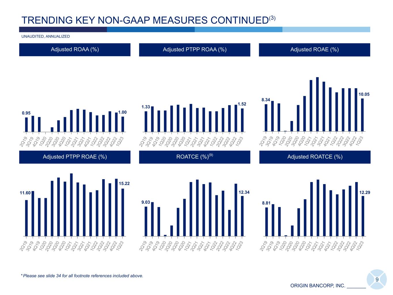 ORIGIN BANCORP, INC. _______ TRENDING KEY NON-GAAP MEASURES(3) Adjusted Diluted EPS ($) UNAUDITED Adjusted Net Income ($) Adjusted PTPP Earnings ($) DOLLARS IN THOUSANDS Adjusted Efficiency Ratio (%) 65.38 58.64 2Q 19 3Q 19 4Q 19 1Q 20 2Q 20 3Q 20 4Q 20 1Q 21 2Q 21 3Q 21 4Q 21 1Q 22 2Q 22 3Q 22 4Q 22 1Q 23 23.22 26.53 2Q 19 3Q 19 4Q 19 1Q 20 2Q 20 3Q 20 4Q 20 1Q 21 2Q 21 3Q 21 4Q 21 1Q 22 2Q 22 3Q 22 4Q 22 1Q 23 Tangible Book Value per Common Share ($)(5) 8 22.99 31.03 2Q 19 3Q 19 4Q 19 1Q 20 2Q 20 3Q 20 4Q 20 1Q 21 2Q 21 3Q 21 4Q 21 1Q 22 2Q 22 3Q 22 4Q 22 1Q 23 Adjusted Tangible Book Value per Common Share ($) 2Q 19 3Q 19 4Q 19 1Q 20 2Q 20 3Q 20 4Q 20 1Q 21 2Q 21 3Q 21 4Q 21 1Q 22 2Q 22 3Q 22 4Q 22 1Q 23 DOLLARS IN THOUSANDS 2Q 19 3Q 19 4Q 19 1Q 20 2Q 20 3Q 20 4Q 20 1Q 21 2Q 21 3Q 21 4Q 21 1Q 22 2Q 22 3Q 22 4Q 22 1Q 23 0.50 2Q 19 3Q 19 4Q 19 1Q 20 2Q 20 3Q 20 4Q 20 1Q 21 2Q 21 3Q 21 4Q 21 1Q 22 2Q 22 3Q 22 4Q 22 1Q 23 0.78 16,683 11,993 24,188 36,627 * Please see slide 34 for all footnote references included above.