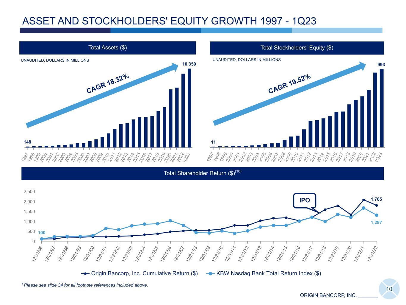 ORIGIN BANCORP, INC. _______ ASSET AND STOCKHOLDERS' EQUITY GROWTH 1997 - 1Q23 UNAUDITED, DOLLARS IN MILLIONS Total Assets ($) 148 10,359 19 97 19 98 19 99 20 00 20 01 20 02 20 03 20 04 20 05 20 06 20 07 20 08 20 09 20 10 20 11 20 12 20 13 20 14 20 15 20 16 20 17 20 18 20 19 20 20 20 21 20 22 1Q 23 Total Stockholders' Equity ($) 11 993 19 97 19 98 19 99 20 00 20 01 20 02 20 03 20 04 20 05 20 06 20 07 20 08 20 09 20 10 20 11 20 12 20 13 20 14 20 15 20 16 20 17 20 18 20 19 20 20 20 21 20 22 1Q 23 CAGR 18.32% CAGR 19.52% 10 100 1,785 1,297 Origin Bancorp, Inc. Cumulative Return ($) KBW Nasdaq Bank Total Return Index ($) 12 /3 1/ 96 12 /3 1/ 97 12 /3 1/ 98 12 /3 1/ 99 12 /3 1/ 00 12 /3 1/ 01 12 /3 1/ 02 12 /3 1/ 03 12 /3 1/ 04 12 /3 1/ 05 12 /3 1/ 06 12 /3 1/ 07 12 /3 1/ 08 12 /3 1/ 09 12 /3 1/ 10 12 /3 1/ 11 12 /3 1/ 12 12 /3 1/ 13 12 /3 1/ 14 12 /3 1/ 15 12 /3 1/ 16 12 /3 1/ 17 12 /3 1/ 18 12 /3 1/ 19 12 /3 1/ 20 12 /3 1/ 21 12 /3 1/ 22 0 500 1,000 1,500 2,000 2,500 Total Shareholder Return ($)(10) IPO * Please see slide 34 for all footnote references included above. UNAUDITED, DOLLARS IN MILLIONS