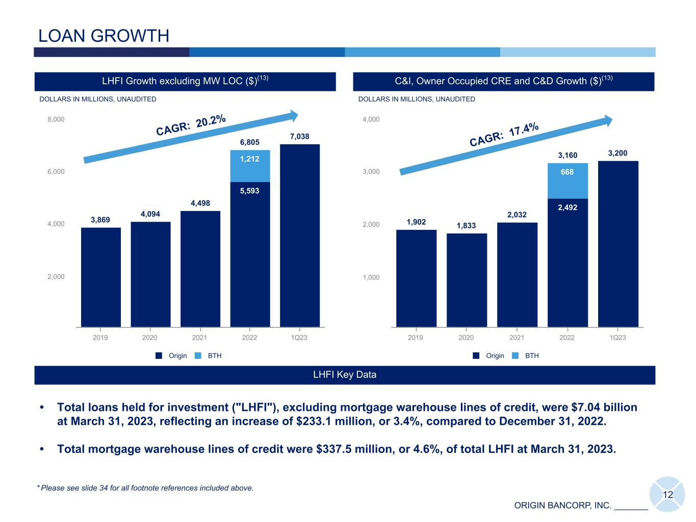 ORIGIN BANCORP, INC. _______ 11 1,956 2,247 2,620 4,747 4,953 1,127 1,343 1,545 2,747 2,824829 904 1,075 1,631 1,754 369 375 DFW Houston East Texas 2019 2020 2021 2022 1Q23 Deposit Trends by Texas Market ($) Loan Trends by Texas Market ($)(12) TEXAS GROWTH STORY Texas Franchise Highlights DOLLARS IN MILLIONS, UNAUDITED • 35 locations throughout 10 counties including the 4th and 5th largest MSAs in the United States.(11) • Texas franchise represents 70% of LHFI, excluding mortgage warehouse loans, and 53% of deposits at March 31, 2023. 1,854 2,574 3,132 4,261 4,196 989 1,581 1,925 2,196 2,053 865 993 1,207 1,173 1,261 892 882 DFW Houston East Texas 2019 2020 2021 2022 1Q23 CAGR 33.1% CAGR 28.6% * Please see slide 34 for all footnote references included above. DOLLARS IN MILLIONS, UNAUDITED