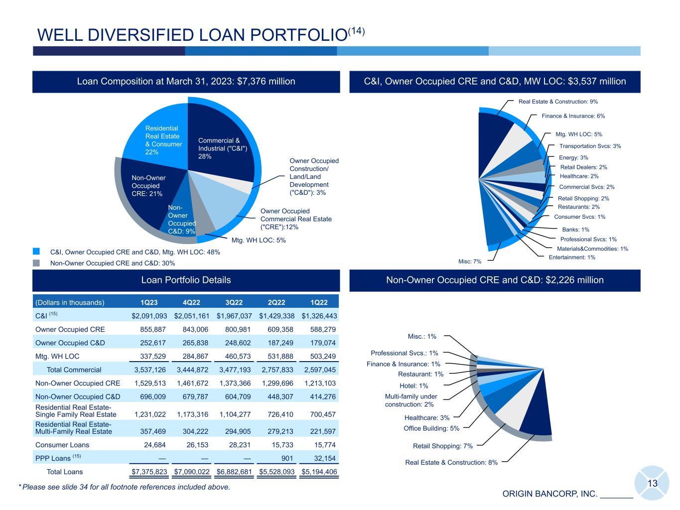 ORIGIN BANCORP, INC. _______ 12 LOAN GROWTH 3,869 4,094 4,498 7,038 6,805 5,593 1,212 Origin BTH 2019 2020 2021 2022 1Q23 2,000 4,000 6,000 8,000 LHFI Key Data DOLLARS IN MILLIONS, UNAUDITED IDT • Total loans held for investment ("LHFI"), excluding mortgage warehouse lines of credit, were $7.04 billion at March 31, 2023, reflecting an increase of $233.1 million, or 3.4%, compared to December 31, 2022. • Total mortgage warehouse lines of credit were $337.5 million, or 4.6%, of total LHFI at March 31, 2023. LHFI Growth excluding MW LOC ($)(13) CAGR: 20.2% 1,902 1,833 2,032 3,2003,160 2,492 668 Origin BTH 2019 2020 2021 2022 1Q23 1,000 2,000 3,000 4,000 C&I, Owner Occupied CRE and C&D Growth ($)(13) CAGR: 17.4% * Please see slide 34 for all footnote references included above. DOLLARS IN MILLIONS, UNAUDITED