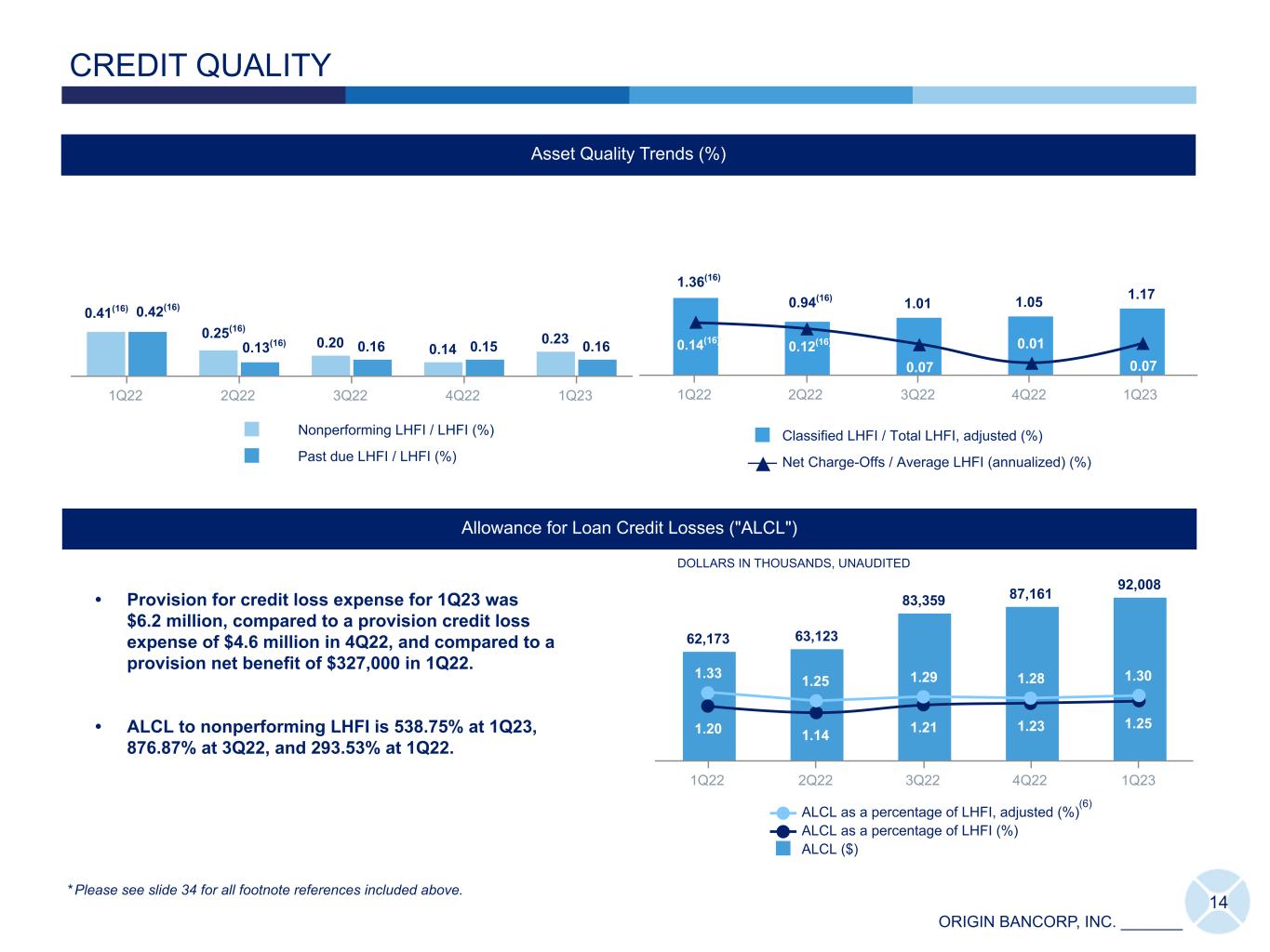 ORIGIN BANCORP, INC. _______ Real Estate & Construction: 8% Retail Shopping: 7% Office Building: 5% Healthcare: 3% Multi-family under construction: 2% Hotel: 1% Restaurant: 1% Finance & Insurance: 1% Professional Svcs.: 1% Misc.: 1% Commercial & Industrial ("C&I") 28% Owner Occupied Construction/ Land/Land Development ("C&D"): 3% Owner Occupied Commercial Real Estate ("CRE"):12% Mtg. WH LOC: 5% Non- Owner Occupied C&D: 9% Non-Owner Occupied CRE: 21% Residential Real Estate & Consumer 22% Real Estate & Construction: 9% Finance & Insurance: 6% Mtg. WH LOC: 5% Transportation Svcs: 3% Energy: 3% Retail Dealers: 2% Healthcare: 2% Commercial Svcs: 2% Retail Shopping: 2% Restaurants: 2% Consumer Svcs: 1% Banks: 1% Professional Svcs: 1% Materials&Commodities: 1% Entertainment: 1% Misc: 7% 13 WELL DIVERSIFIED LOAN PORTFOLIO(14) (Dollars in thousands) 1Q23 4Q22 3Q22 2Q22 1Q22 C&I (15) $ 2,091,093 $ 2,051,161 $ 1,967,037 $ 1,429,338 $ 1,326,443 Owner Occupied CRE 855,887 843,006 800,981 609,358 588,279 Owner Occupied C&D 252,617 265,838 248,602 187,249 179,074 Mtg. WH LOC 337,529 284,867 460,573 531,888 503,249 Total Commercial 3,537,126 3,444,872 3,477,193 2,757,833 2,597,045 Non-Owner Occupied CRE 1,529,513 1,461,672 1,373,366 1,299,696 1,213,103 Non-Owner Occupied C&D 696,009 679,787 604,709 448,307 414,276 Residential Real Estate- Single Family Real Estate 1,231,022 1,173,316 1,104,277 726,410 700,457 Residential Real Estate- Multi-Family Real Estate 357,469 304,222 294,905 279,213 221,597 Consumer Loans 24,684 26,153 28,231 15,733 15,774 PPP Loans (15) — — — 901 32,154 Total Loans $ 7,375,823 $ 7,090,022 $ 6,882,681 $ 5,528,093 $ 5,194,406 Loan Portfolio Details Non-Owner Occupied CRE and C&D: $2,226 million C&I, Owner Occupied CRE and C&D, MW LOC: $3,537 million C&I, Owner Occupied CRE and C&D, Mtg. WH LOC: 48% Non-Owner Occupied CRE and C&D: 30% Loan Composition at March 31, 2023: $7,376 million * Please see slide 34 for all footnote references included above.