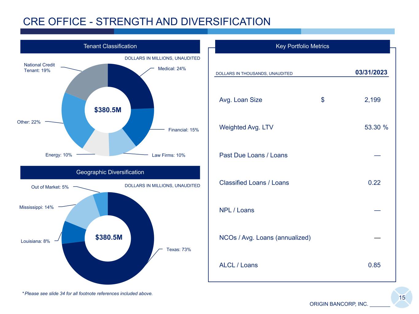 ORIGIN BANCORP, INC. _______ 1.01 1.05 1.17 Classified LHFI / Total LHFI, adjusted (%) Net Charge-Offs / Average LHFI (annualized) (%) 1Q22 2Q22 3Q22 4Q22 1Q23 0.07 0.01 0.07 0.20 0.14 0.230.16 0.15 0.16 Nonperforming LHFI / LHFI (%) Past due LHFI / LHFI (%) 1Q22 2Q22 3Q22 4Q22 1Q23 14 CREDIT QUALITY Asset Quality Trends (%) Allowance for Loan Credit Losses ("ALCL") 62,173 63,123 83,359 87,161 92,008 1.20 1.14 1.21 1.23 1.25 1.33 1.25 1.29 1.28 1.30 ALCL as a percentage of LHFI, adjusted (%) ALCL as a percentage of LHFI (%) ALCL ($) 1Q22 2Q22 3Q22 4Q22 1Q23 • Provision for credit loss expense for 1Q23 was $6.2 million, compared to a provision credit loss expense of $4.6 million in 4Q22, and compared to a provision net benefit of $327,000 in 1Q22. • ALCL to nonperforming LHFI is 538.75% at 1Q23, 876.87% at 3Q22, and 293.53% at 1Q22. DOLLARS IN THOUSANDS, UNAUDITED 0.14(16) 0.41(16) 0.42(16) 0.25(16) 0.13(16) (6) 0.12(16) 1.36(16) 0.94(16) * Please see slide 34 for all footnote references included above.