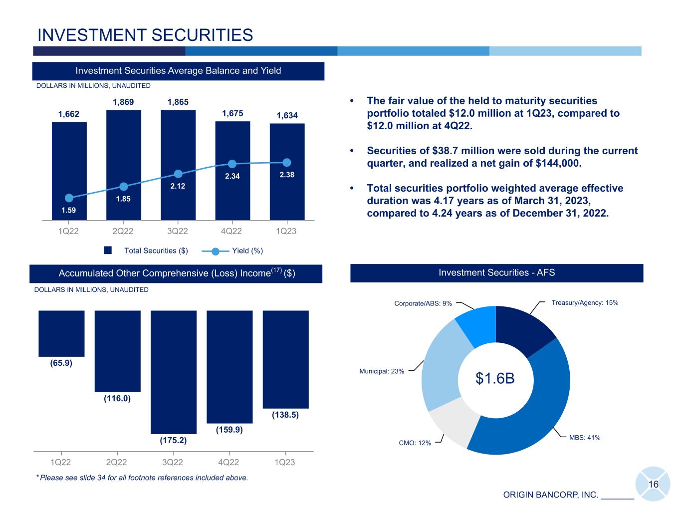 ORIGIN BANCORP, INC. _______ Treasury/Agency: 15% MBS: 41% CMO: 12% Municipal: 23% Corporate/ABS: 9% 1,662 1,869 1,865 1,675 1,634 1.59 1.85 2.12 2.34 2.38 Total Securities ($) Yield (%) 1Q22 2Q22 3Q22 4Q22 1Q23 Investment Securities Average Balance and Yield INVESTMENT SECURITIES DOLLARS IN MILLIONS, UNAUDITED • The fair value of the held to maturity securities portfolio totaled $12.0 million at 1Q23, compared to $12.0 million at 4Q22. • Securities of $38.7 million were sold during the current quarter, and realized a net gain of $144,000. • Total securities portfolio weighted average effective duration was 4.17 years as of March 31, 2023, compared to 4.24 years as of December 31, 2022. 16 (65.9) (116.0) (175.2) (159.9) (138.5) 1Q22 2Q22 3Q22 4Q22 1Q23 Accumulated Other Comprehensive (Loss) Income(17) ($) Investment Securities - AFS * Please see slide 34 for all footnote references included above. $1.6B DOLLARS IN MILLIONS, UNAUDITED