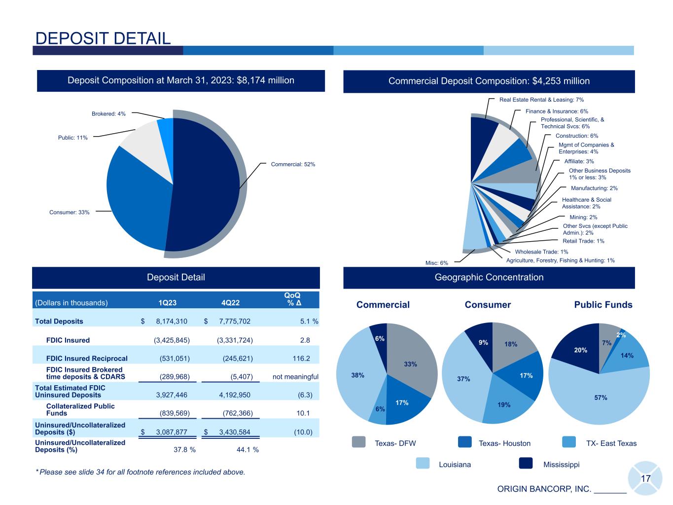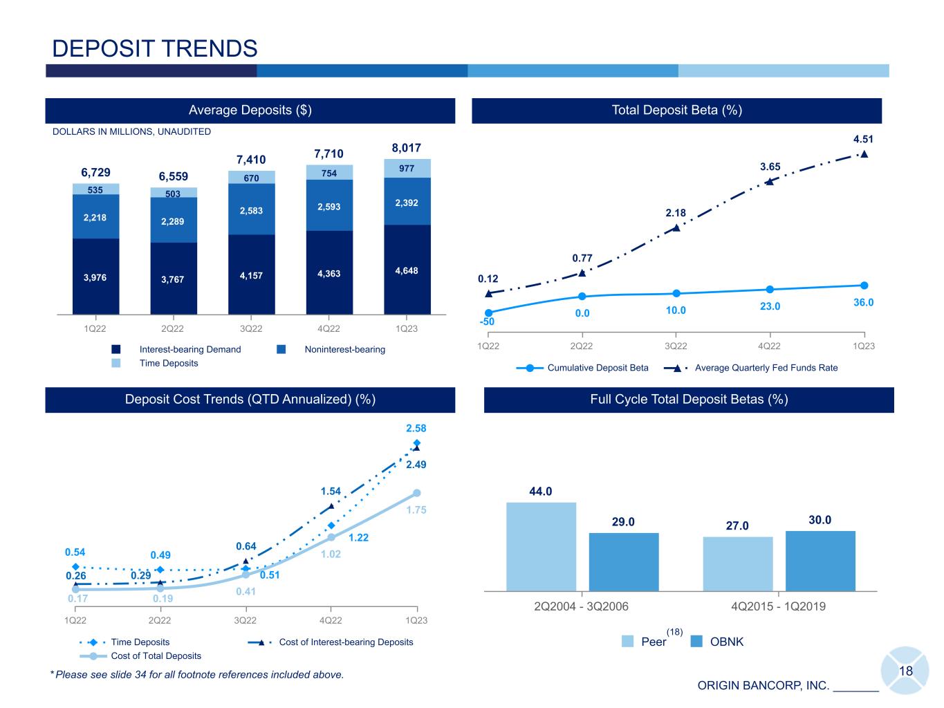 ORIGIN BANCORP, INC. _______ Commercial: 52% Consumer: 33% Public: 11% Brokered: 4% Real Estate Rental & Leasing: 7% Finance & Insurance: 6% Professional, Scientific, & Technical Svcs: 6% Construction: 6% Mgmt of Companies & Enterprises: 4% Affiliate: 3% Other Business Deposits 1% or less: 3% Manufacturing: 2% Healthcare & Social Assistance: 2% Mining: 2% Other Svcs (except Public Admin.): 2% Retail Trade: 1% Misc: 6% 17 DEPOSIT DETAIL (Dollars in thousands) 1Q23 4Q22 QoQ % Δ Total Deposits $ 8,174,310 $ 7,775,702 5.1 % FDIC Insured (3,425,845) (3,331,724) 2.8 FDIC Insured Reciprocal (531,051) (245,621) 116.2 FDIC Insured Brokered time deposits & CDARS (289,968) (5,407) not meaningful Total Estimated FDIC Uninsured Deposits 3,927,446 4,192,950 (6.3) Collateralized Public Funds (839,569) (762,366) 10.1 Uninsured/Uncollateralized Deposits ($) $ 3,087,877 $ 3,430,584 (10.0) Uninsured/Uncollateralized Deposits (%) 37.8 % 44.1 % Deposit Detail Geographic Concentration Commercial Deposit Composition: $4,253 millionDeposit Composition at March 31, 2023: $8,174 million Commercial Public Funds 33% 17% 6% 38% 6% Consumer MississippiLouisiana Texas- DFW TX- East TexasTexas- Houston Agriculture, Forestry, Fishing & Hunting: 1% * Please see slide 34 for all footnote references included above. Wholesale Trade: 1% 18% 17% 19% 37% 9% 7% 2% 14% 57% 20%