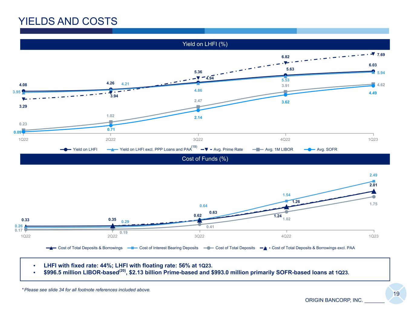 ORIGIN BANCORP, INC. _______ 18 6,729 6,559 7,410 7,710 8,017 3,976 3,767 4,157 4,363 4,648 2,218 2,289 2,583 2,593 2,392 535 503 670 754 977 Interest-bearing Demand Noninterest-bearing Time Deposits 1Q22 2Q22 3Q22 4Q22 1Q23 Average Deposits ($) DEPOSIT TRENDS 0.54 0.49 2.58 0.64 1.54 2.49 0.41 1.02 1.75 Time Deposits Cost of Interest-bearing Deposits Cost of Total Deposits 1Q22 2Q22 3Q22 4Q22 1Q23 Deposit Cost Trends (QTD Annualized) (%) IDT Total Deposit Beta (%) 0.19 0.510.290.26 Full Cycle Total Deposit Betas (%) 44.0 27.029.0 30.0 Peer OBNK 2Q2004 - 3Q2006 4Q2015 - 1Q2019 (18) 0.17 1.22 -50 * Please see slide 34 for all footnote references included above. DOLLARS IN MILLIONS, UNAUDITED 0.0 10.0 23.0 36.0 0.12 0.77 2.18 3.65 4.51 Cumulative Deposit Beta Average Quarterly Fed Funds Rate 1Q22 2Q22 3Q22 4Q22 1Q23