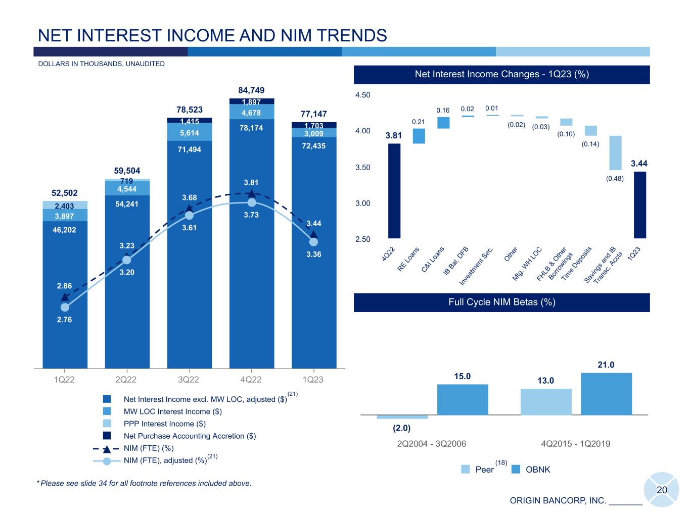 ORIGIN BANCORP, INC. _______ 20 DOLLARS IN THOUSANDS, UNAUDITED 52,502 59,504 78,523 84,749 77,147 46,202 54,241 71,494 78,174 72,435 3,897 4,544 5,614 4,678 3,009 2,403 719 1,415 1,897 1,703 2.86 3.23 3.68 3.81 3.44 2.76 3.20 3.61 3.73 3.36 Net Interest Income excl. MW LOC, adjusted ($) MW LOC Interest Income ($) PPP Interest Income ($) Net Purchase Accounting Accretion ($) NIM (FTE) (%) NIM (FTE), adjusted (%) 1Q22 2Q22 3Q22 4Q22 1Q23 NET INTEREST INCOME AND NIM TRENDS 3.44 3.81 0.21 0.16 0.02 0.01 (0.02) (0.03) (0.10) (0.14) (0.48) 4Q 22 RE Lo an s C&I L oa ns IB B al. D FB Inv es tm en t S ec . Othe r Mtg. W H LO C FH LB & O the r Bor ro wing s Tim e D ep os its Sav ing s a nd IB Tr an sc . A cc ts 1Q 23 2.50 3.00 3.50 4.00 4.50 Net Interest Income Changes - 1Q23 (%) Full Cycle NIM Betas (%) (21) (21) (2.0) 13.015.0 21.0 Peer OBNK 2Q2004 - 3Q2006 4Q2015 - 1Q2019 (18) * Please see slide 34 for all footnote references included above.