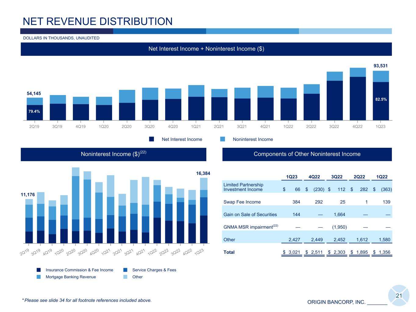 ORIGIN BANCORP, INC. _______ Insurance Commission & Fee Income Service Charges & Fees Mortgage Banking Revenue Other 2Q19 3Q19 4Q19 1Q20 2Q20 3Q20 4Q20 1Q21 2Q21 3Q21 4Q21 1Q22 2Q22 3Q22 4Q22 1Q23 21 Net Interest Income Noninterest Income 2Q19 3Q19 4Q19 1Q20 2Q20 3Q20 4Q20 1Q21 2Q21 3Q21 4Q21 1Q22 2Q22 3Q22 4Q22 1Q23 Noninterest Income ($)(22) Net Interest Income + Noninterest Income ($) NET REVENUE DISTRIBUTION Components of Other Noninterest Income 93,531 1Q23 4Q22 3Q22 2Q22 1Q22 Limited Partnership Investment Income $ 66 $ (230) $ 112 $ 282 $ (363) Swap Fee Income 384 292 25 1 139 Gain on Sale of Securities 144 — 1,664 — — GNMA MSR impairment(22) — — (1,950) — — Other 2,427 2,449 2,452 1,612 1,580 Total $ 3,021 $ 2,511 $ 2,303 $ 1,895 $ 1,356 54,145 16,384 79.4% 82.5% 11,176 * Please see slide 34 for all footnote references included above. DOLLARS IN THOUSANDS, UNAUDITED