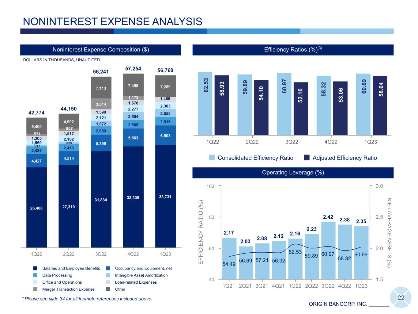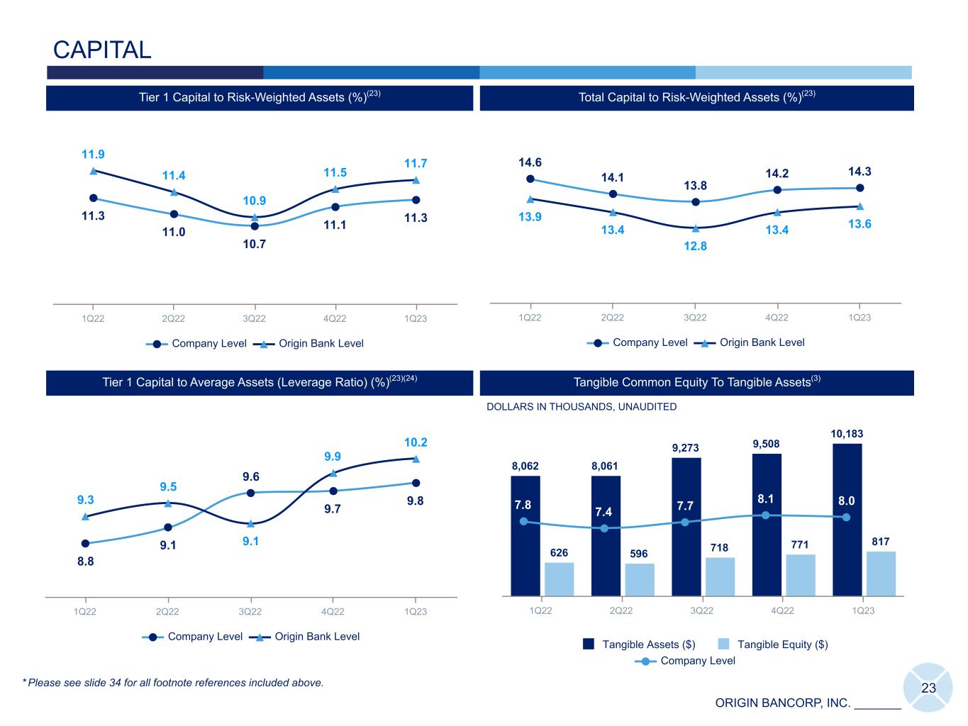 ORIGIN BANCORP, INC. _______ 42,774 44,150 56,241 57,254 56,760 26,488 27,310 31,834 33,339 33,731 4,427 4,514 5,399 5,863 6,503 2,486 2,413 2,689 2,868 2,9161,872 2,554 2,553 1,560 2,162 2,121 2,277 2,303 1,305 1,517 1,599 1,6763,614 5,400 4,902 7,113 7,498 7,289 Salaries and Employee Benefits Occupancy and Equipment, net Data Processing Intangible Asset Amortization Office and Operations Loan-related Expenses Merger Transaction Expense Other 1Q22 2Q22 3Q22 4Q22 1Q23 22 Efficiency Ratios (%)(3) NONINTEREST EXPENSE ANALYSIS DOLLARS IN THOUSANDS, UNAUDITED Noninterest Expense Composition ($) Consolidated Efficiency Ratio Adjusted Efficiency Ratio 1Q22 2Q22 3Q22 4Q22 1Q23 62 .5 3 59 .8 9 58 .9 3 54 .1 0 Operating Leverage (%) E FF IC IE N C Y R A TI O (% ) N IE / A V E R A G E A S S E TS (% ) 2.17 2.03 2.08 2.12 2.16 2.23 2.42 2.38 2.35 54.49 56.69 57.21 56.92 62.53 59.89 60.97 58.32 60.69 1Q21 2Q21 3Q21 4Q21 1Q22 2Q22 3Q22 4Q22 1Q23 40 60 80 100 1.5 2.0 2.5 3.0 60 .9 7 52 .1 6 58 .3 2 53 .0 6 58 .6 4 60 .6 9 571 807 1,179 1,465 537 525 * Please see slide 34 for all footnote references included above.