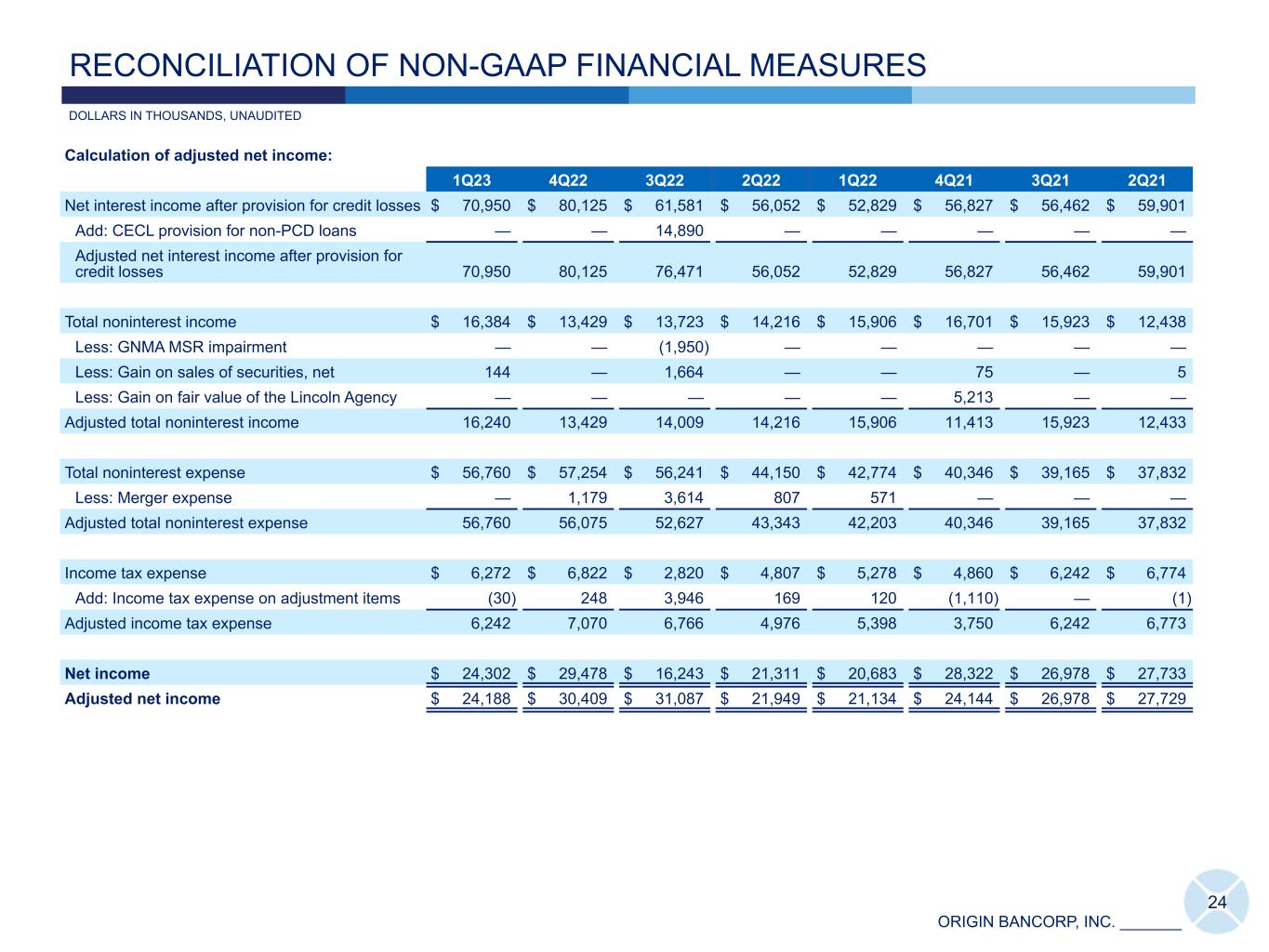ORIGIN BANCORP, INC. _______ Calculation of adjusted net income: 1Q23 4Q22 3Q22 2Q22 1Q22 4Q21 3Q21 2Q21 Net interest income after provision for credit losses $ 70,950 $ 80,125 $ 61,581 $ 56,052 $ 52,829 $ 56,827 $ 56,462 $ 59,901 Add: CECL provision for non-PCD loans — — 14,890 — — — — — Adjusted net interest income after provision for credit losses 70,950 80,125 76,471 56,052 52,829 56,827 56,462 59,901 Total noninterest income $ 16,384 $ 13,429 $ 13,723 $ 14,216 $ 15,906 $ 16,701 $ 15,923 $ 12,438 Less: GNMA MSR impairment — — (1,950) — — — — — Less: Gain on sales of securities, net 144 — 1,664 — — 75 — 5 Less: Gain on fair value of the Lincoln Agency — — — — — 5,213 — — Adjusted total noninterest income 16,240 13,429 14,009 14,216 15,906 11,413 15,923 12,433 Total noninterest expense $ 56,760 $ 57,254 $ 56,241 $ 44,150 $ 42,774 $ 40,346 $ 39,165 $ 37,832 Less: Merger expense — 1,179 3,614 807 571 — — — Adjusted total noninterest expense 56,760 56,075 52,627 43,343 42,203 40,346 39,165 37,832 Income tax expense $ 6,272 $ 6,822 $ 2,820 $ 4,807 $ 5,278 $ 4,860 $ 6,242 $ 6,774 Add: Income tax expense on adjustment items (30) 248 3,946 169 120 (1,110) — (1) Adjusted income tax expense 6,242 7,070 6,766 4,976 5,398 3,750 6,242 6,773 Net income $ 24,302 $ 29,478 $ 16,243 $ 21,311 $ 20,683 $ 28,322 $ 26,978 $ 27,733 Adjusted net income $ 24,188 $ 30,409 $ 31,087 $ 21,949 $ 21,134 $ 24,144 $ 26,978 $ 27,729 24 DOLLARS IN THOUSANDS, UNAUDITED RECONCILIATION OF NON-GAAP FINANCIAL MEASURES