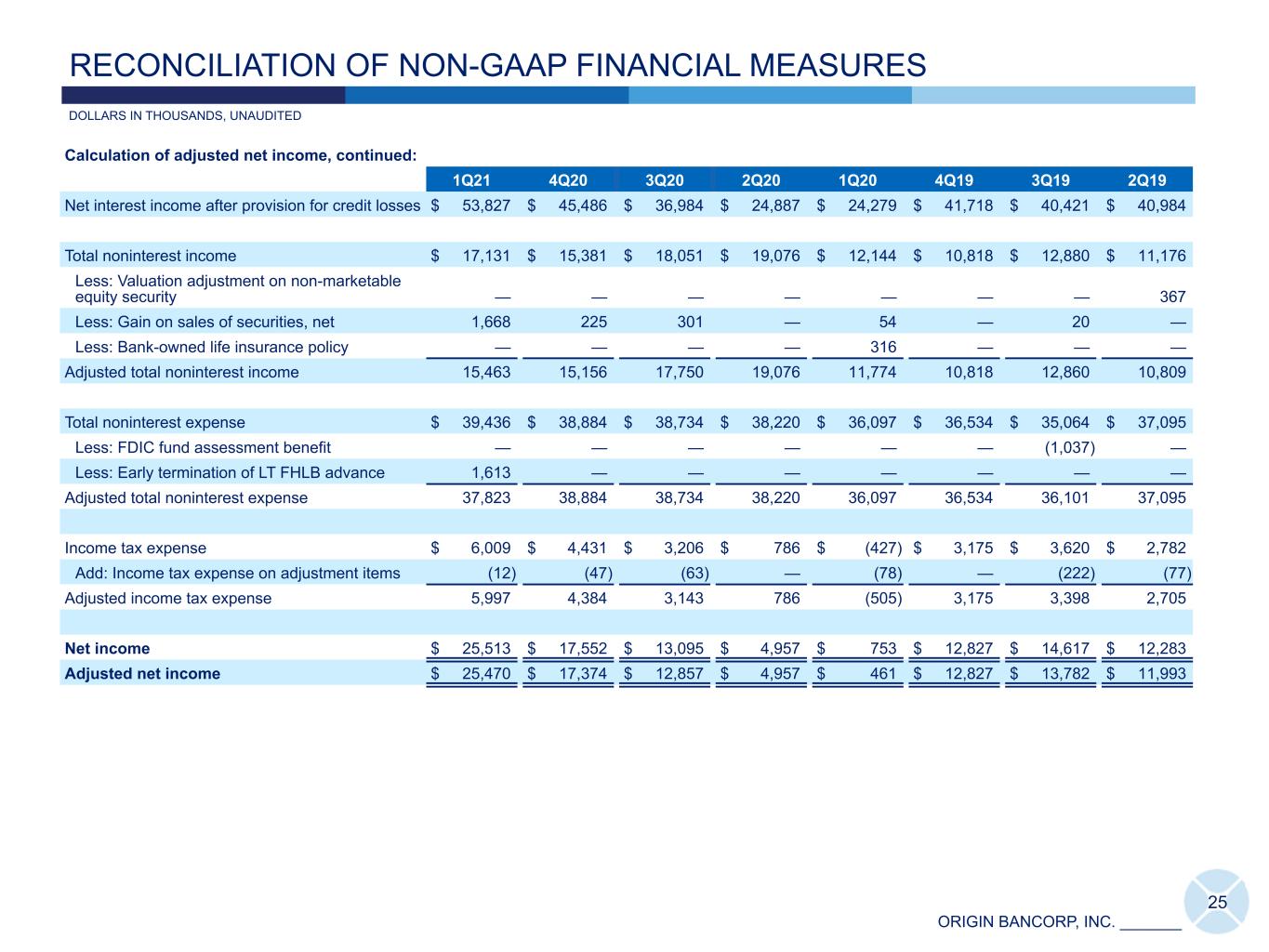 ORIGIN BANCORP, INC. _______ Calculation of adjusted net income, continued: 1Q21 4Q20 3Q20 2Q20 1Q20 4Q19 3Q19 2Q19 Net interest income after provision for credit losses $ 53,827 $ 45,486 $ 36,984 $ 24,887 $ 24,279 $ 41,718 $ 40,421 $ 40,984 Total noninterest income $ 17,131 $ 15,381 $ 18,051 $ 19,076 $ 12,144 $ 10,818 $ 12,880 $ 11,176 Less: Valuation adjustment on non-marketable equity security — — — — — — — 367 Less: Gain on sales of securities, net 1,668 225 301 — 54 — 20 — Less: Bank-owned life insurance policy — — — — 316 — — — Adjusted total noninterest income 15,463 15,156 17,750 19,076 11,774 10,818 12,860 10,809 Total noninterest expense $ 39,436 $ 38,884 $ 38,734 $ 38,220 $ 36,097 $ 36,534 $ 35,064 $ 37,095 Less: FDIC fund assessment benefit — — — — — — (1,037) — Less: Early termination of LT FHLB advance 1,613 — — — — — — — Adjusted total noninterest expense 37,823 38,884 38,734 38,220 36,097 36,534 36,101 37,095 Income tax expense $ 6,009 $ 4,431 $ 3,206 $ 786 $ (427) $ 3,175 $ 3,620 $ 2,782 Add: Income tax expense on adjustment items (12) (47) (63) — (78) — (222) (77) Adjusted income tax expense 5,997 4,384 3,143 786 (505) 3,175 3,398 2,705 Net income $ 25,513 $ 17,552 $ 13,095 $ 4,957 $ 753 $ 12,827 $ 14,617 $ 12,283 Adjusted net income $ 25,470 $ 17,374 $ 12,857 $ 4,957 $ 461 $ 12,827 $ 13,782 $ 11,993 25 DOLLARS IN THOUSANDS, UNAUDITED RECONCILIATION OF NON-GAAP FINANCIAL MEASURES