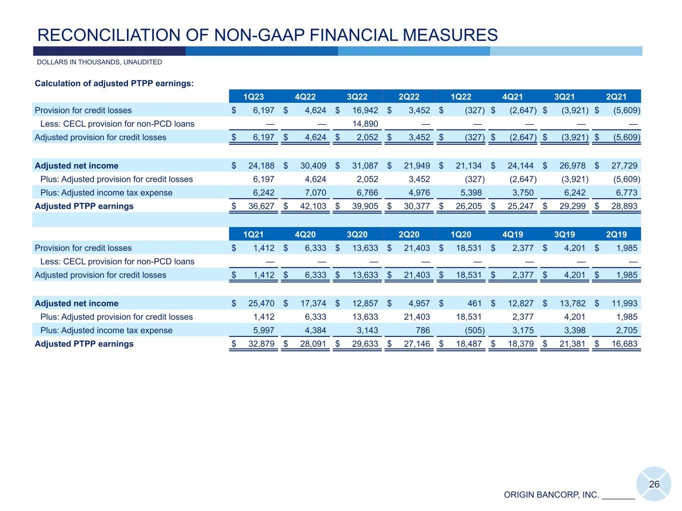 ORIGIN BANCORP, INC. _______ Calculation of adjusted PTPP earnings: 1Q23 4Q22 3Q22 2Q22 1Q22 4Q21 3Q21 2Q21 Provision for credit losses $ 6,197 $ 4,624 $ 16,942 $ 3,452 $ (327) $ (2,647) $ (3,921) $ (5,609) Less: CECL provision for non-PCD loans — — 14,890 — — — — — Adjusted provision for credit losses $ 6,197 $ 4,624 $ 2,052 $ 3,452 $ (327) $ (2,647) $ (3,921) $ (5,609) Adjusted net income $ 24,188 $ 30,409 $ 31,087 $ 21,949 $ 21,134 $ 24,144 $ 26,978 $ 27,729 Plus: Adjusted provision for credit losses 6,197 4,624 2,052 3,452 (327) (2,647) (3,921) (5,609) Plus: Adjusted income tax expense 6,242 7,070 6,766 4,976 5,398 3,750 6,242 6,773 Adjusted PTPP earnings $ 36,627 $ 42,103 $ 39,905 $ 30,377 $ 26,205 $ 25,247 $ 29,299 $ 28,893 1Q21 4Q20 3Q20 2Q20 1Q20 4Q19 3Q19 2Q19 Provision for credit losses $ 1,412 $ 6,333 $ 13,633 $ 21,403 $ 18,531 $ 2,377 $ 4,201 $ 1,985 Less: CECL provision for non-PCD loans — — — — — — — — Adjusted provision for credit losses $ 1,412 $ 6,333 $ 13,633 $ 21,403 $ 18,531 $ 2,377 $ 4,201 $ 1,985 Adjusted net income $ 25,470 $ 17,374 $ 12,857 $ 4,957 $ 461 $ 12,827 $ 13,782 $ 11,993 Plus: Adjusted provision for credit losses 1,412 6,333 13,633 21,403 18,531 2,377 4,201 1,985 Plus: Adjusted income tax expense 5,997 4,384 3,143 786 (505) 3,175 3,398 2,705 Adjusted PTPP earnings $ 32,879 $ 28,091 $ 29,633 $ 27,146 $ 18,487 $ 18,379 $ 21,381 $ 16,683 26 DOLLARS IN THOUSANDS, UNAUDITED RECONCILIATION OF NON-GAAP FINANCIAL MEASURES