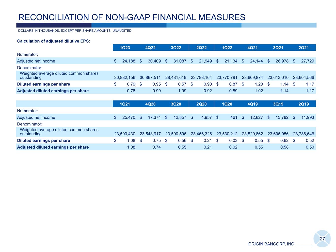 ORIGIN BANCORP, INC. _______ Calculation of adjusted dilutive EPS: 1Q23 4Q22 3Q22 2Q22 1Q22 4Q21 3Q21 2Q21 Numerator: Adjusted net income $ 24,188 $ 30,409 $ 31,087 $ 21,949 $ 21,134 $ 24,144 $ 26,978 $ 27,729 Denominator: Weighted average diluted common shares outstanding 30,882,156 30,867,511 28,481,619 23,788,164 23,770,791 23,609,874 23,613,010 23,604,566 Diluted earnings per share $ 0.79 $ 0.95 $ 0.57 $ 0.90 $ 0.87 $ 1.20 $ 1.14 $ 1.17 Adjusted diluted earnings per share 0.78 0.99 1.09 0.92 0.89 1.02 1.14 1.17 1Q21 4Q20 3Q20 2Q20 1Q20 4Q19 3Q19 2Q19 Numerator: Adjusted net income $ 25,470 $ 17,374 $ 12,857 $ 4,957 $ 461 $ 12,827 $ 13,782 $ 11,993 Denominator: Weighted average diluted common shares outstanding 23,590,430 23,543,917 23,500,596 23,466,326 23,530,212 23,529,862 23,606,956 23,786,646 Diluted earnings per share $ 1.08 $ 0.75 $ 0.56 $ 0.21 $ 0.03 $ 0.55 $ 0.62 $ 0.52 Adjusted diluted earnings per share 1.08 0.74 0.55 0.21 0.02 0.55 0.58 0.50 27 RECONCILIATION OF NON-GAAP FINANCIAL MEASURES DOLLARS IN THOUSANDS, EXCEPT PER SHARE AMOUNTS, UNAUDITED