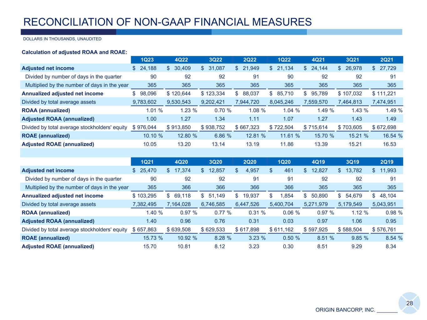 ORIGIN BANCORP, INC. _______ Calculation of adjusted ROAA and ROAE: 1Q23 4Q22 3Q22 2Q22 1Q22 4Q21 3Q21 2Q21 Adjusted net income $ 24,188 $ 30,409 $ 31,087 $ 21,949 $ 21,134 $ 24,144 $ 26,978 $ 27,729 Divided by number of days in the quarter 90 92 92 91 90 92 92 91 Multiplied by the number of days in the year 365 365 365 365 365 365 365 365 Annualized adjusted net income $ 98,096 $ 120,644 $ 123,334 $ 88,037 $ 85,710 $ 95,789 $ 107,032 $ 111,221 Divided by total average assets 9,783,602 9,530,543 9,202,421 7,944,720 8,045,246 7,559,570 7,464,813 7,474,951 ROAA (annualized) 1.01 % 1.23 % 0.70 % 1.08 % 1.04 % 1.49 % 1.43 % 1.49 % Adjusted ROAA (annualized) 1.00 1.27 1.34 1.11 1.07 1.27 1.43 1.49 Divided by total average stockholders' equity $ 976,044 $ 913,850 $ 938,752 $ 667,323 $ 722,504 $ 715,614 $ 703,605 $ 672,698 ROAE (annualized) 10.10 % 12.80 % 6.86 % 12.81 % 11.61 % 15.70 % 15.21 % 16.54 % Adjusted ROAE (annualized) 10.05 13.20 13.14 13.19 11.86 13.39 15.21 16.53 1Q21 4Q20 3Q20 2Q20 1Q20 4Q19 3Q19 2Q19 Adjusted net income $ 25,470 $ 17,374 $ 12,857 $ 4,957 $ 461 $ 12,827 $ 13,782 $ 11,993 Divided by number of days in the quarter 90 92 92 91 91 92 92 91 Multiplied by the number of days in the year 365 366 366 366 366 365 365 365 Annualized adjusted net income $ 103,295 $ 69,118 $ 51,149 $ 19,937 $ 1,854 $ 50,890 $ 54,679 $ 48,104 Divided by total average assets 7,382,495 7,164,028 6,746,585 6,447,526 5,400,704 5,271,979 5,179,549 5,043,951 ROAA (annualized) 1.40 % 0.97 % 0.77 % 0.31 % 0.06 % 0.97 % 1.12 % 0.98 % Adjusted ROAA (annualized) 1.40 0.96 0.76 0.31 0.03 0.97 1.06 0.95 Divided by total average stockholders' equity $ 657,863 $ 639,508 $ 629,533 $ 617,898 $ 611,162 $ 597,925 $ 588,504 $ 576,761 ROAE (annualized) 15.73 % 10.92 % 8.28 % 3.23 % 0.50 % 8.51 % 9.85 % 8.54 % Adjusted ROAE (annualized) 15.70 10.81 8.12 3.23 0.30 8.51 9.29 8.34 28 DOLLARS IN THOUSANDS, UNAUDITED RECONCILIATION OF NON-GAAP FINANCIAL MEASURES