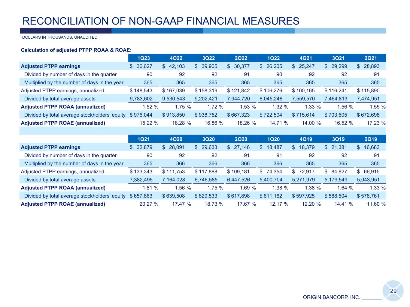 ORIGIN BANCORP, INC. _______ Calculation of adjusted PTPP ROAA & ROAE: 1Q23 4Q22 3Q22 2Q22 1Q22 4Q21 3Q21 2Q21 Adjusted PTPP earnings $ 36,627 $ 42,103 $ 39,905 $ 30,377 $ 26,205 $ 25,247 $ 29,299 $ 28,893 Divided by number of days in the quarter 90 92 92 91 90 92 92 91 Multiplied by the number of days in the year 365 365 365 365 365 365 365 365 Adjusted PTPP earnings, annualized $ 148,543 $ 167,039 $ 158,319 $ 121,842 $ 106,276 $ 100,165 $ 116,241 $ 115,890 Divided by total average assets 9,783,602 9,530,543 9,202,421 7,944,720 8,045,246 7,559,570 7,464,813 7,474,951 Adjusted PTPP ROAA (annualized) 1.52 % 1.75 % 1.72 % 1.53 % 1.32 % 1.33 % 1.56 % 1.55 % Divided by total average stockholders' equity $ 976,044 $ 913,850 $ 938,752 $ 667,323 $ 722,504 $ 715,614 $ 703,605 $ 672,698 Adjusted PTPP ROAE (annualized) 15.22 % 18.28 % 16.86 % 18.26 % 14.71 % 14.00 % 16.52 % 17.23 % 1Q21 4Q20 3Q20 2Q20 1Q20 4Q19 3Q19 2Q19 Adjusted PTPP earnings $ 32,879 $ 28,091 $ 29,633 $ 27,146 $ 18,487 $ 18,379 $ 21,381 $ 16,683 Divided by number of days in the quarter 90 92 92 91 91 92 92 91 Multiplied by the number of days in the year 365 366 366 366 366 365 365 365 Adjusted PTPP earnings, annualized $ 133,343 $ 111,753 $ 117,888 $ 109,181 $ 74,354 $ 72,917 $ 84,827 $ 66,915 Divided by total average assets 7,382,495 7,164,028 6,746,585 6,447,526 5,400,704 5,271,979 5,179,549 5,043,951 Adjusted PTPP ROAA (annualized) 1.81 % 1.56 % 1.75 % 1.69 % 1.38 % 1.38 % 1.64 % 1.33 % Divided by total average stockholders' equity $ 657,863 $ 639,508 $ 629,533 $ 617,898 $ 611,162 $ 597,925 $ 588,504 $ 576,761 Adjusted PTPP ROAE (annualized) 20.27 % 17.47 % 18.73 % 17.67 % 12.17 % 12.20 % 14.41 % 11.60 % 29 DOLLARS IN THOUSANDS, UNAUDITED RECONCILIATION OF NON-GAAP FINANCIAL MEASURES