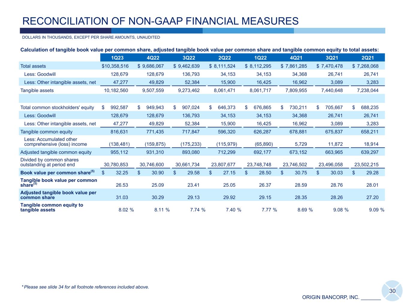 ORIGIN BANCORP, INC. _______ Calculation of tangible book value per common share, adjusted tangible book value per common share and tangible common equity to total assets: 1Q23 4Q22 3Q22 2Q22 1Q22 4Q21 3Q21 2Q21 Total assets $ 10,358,516 $ 9,686,067 $ 9,462,639 $ 8,111,524 $ 8,112,295 $ 7,861,285 $ 7,470,478 $ 7,268,068 Less: Goodwill 128,679 128,679 136,793 34,153 34,153 34,368 26,741 26,741 Less: Other intangible assets, net 47,277 49,829 52,384 15,900 16,425 16,962 3,089 3,283 Tangible assets 10,182,560 9,507,559 9,273,462 8,061,471 8,061,717 7,809,955 7,440,648 7,238,044 Total common stockholders' equity $ 992,587 $ 949,943 $ 907,024 $ 646,373 $ 676,865 $ 730,211 $ 705,667 $ 688,235 Less: Goodwill 128,679 128,679 136,793 34,153 34,153 34,368 26,741 26,741 Less: Other intangible assets, net 47,277 49,829 52,384 15,900 16,425 16,962 3,089 3,283 Tangible common equity 816,631 771,435 717,847 596,320 626,287 678,881 675,837 658,211 Less: Accumulated other comprehensive (loss) income (138,481) (159,875) (175,233) (115,979) (65,890) 5,729 11,872 18,914 Adjusted tangible common equity 955,112 931,310 893,080 712,299 692,177 673,152 663,965 639,297 Divided by common shares outstanding at period end 30,780,853 30,746,600 30,661,734 23,807,677 23,748,748 23,746,502 23,496,058 23,502,215 Book value per common share(5) $ 32.25 $ 30.90 $ 29.58 $ 27.15 $ 28.50 $ 30.75 $ 30.03 $ 29.28 Tangible book value per common share(5) 26.53 25.09 23.41 25.05 26.37 28.59 28.76 28.01 Adjusted tangible book value per common share 31.03 30.29 29.13 29.92 29.15 28.35 28.26 27.20 Tangible common equity to tangible assets 8.02 % 8.11 % 7.74 % 7.40 % 7.77 % 8.69 % 9.08 % 9.09 % 30 RECONCILIATION OF NON-GAAP FINANCIAL MEASURES * Please see slide 34 for all footnote references included above. DOLLARS IN THOUSANDS, EXCEPT PER SHARE AMOUNTS, UNAUDITED