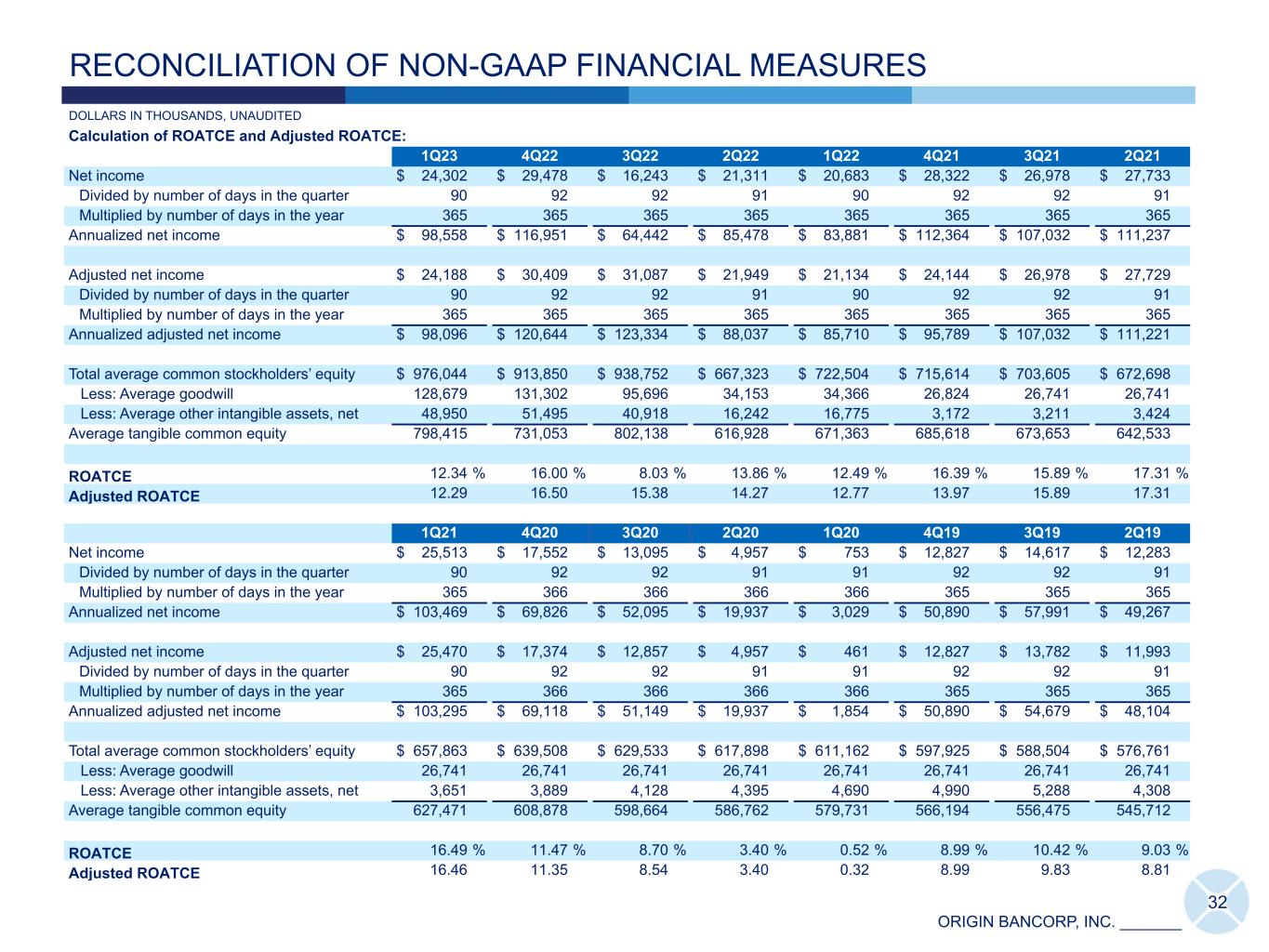 ORIGIN BANCORP, INC. _______ Calculation of ROATCE and Adjusted ROATCE: 1Q23 4Q22 3Q22 2Q22 1Q22 4Q21 3Q21 2Q21 Net income $ 24,302 $ 29,478 $ 16,243 $ 21,311 $ 20,683 $ 28,322 $ 26,978 $ 27,733 Divided by number of days in the quarter 90 92 92 91 90 92 92 91 Multiplied by number of days in the year 365 365 365 365 365 365 365 365 Annualized net income $ 98,558 $ 116,951 $ 64,442 $ 85,478 $ 83,881 $ 112,364 $ 107,032 $ 111,237 Adjusted net income $ 24,188 $ 30,409 $ 31,087 $ 21,949 $ 21,134 $ 24,144 $ 26,978 $ 27,729 Divided by number of days in the quarter 90 92 92 91 90 92 92 91 Multiplied by number of days in the year 365 365 365 365 365 365 365 365 Annualized adjusted net income $ 98,096 $ 120,644 $ 123,334 $ 88,037 $ 85,710 $ 95,789 $ 107,032 $ 111,221 Total average common stockholders’ equity $ 976,044 $ 913,850 $ 938,752 $ 667,323 $ 722,504 $ 715,614 $ 703,605 $ 672,698 Less: Average goodwill 128,679 131,302 95,696 34,153 34,366 26,824 26,741 26,741 Less: Average other intangible assets, net 48,950 51,495 40,918 16,242 16,775 3,172 3,211 3,424 Average tangible common equity 798,415 731,053 802,138 616,928 671,363 685,618 673,653 642,533 ROATCE 12.34 % 16.00 % 8.03 % 13.86 % 12.49 % 16.39 % 15.89 % 17.31 % Adjusted ROATCE 12.29 16.50 15.38 14.27 12.77 13.97 15.89 17.31 1Q21 4Q20 3Q20 2Q20 1Q20 4Q19 3Q19 2Q19 Net income $ 25,513 $ 17,552 $ 13,095 $ 4,957 $ 753 $ 12,827 $ 14,617 $ 12,283 Divided by number of days in the quarter 90 92 92 91 91 92 92 91 Multiplied by number of days in the year 365 366 366 366 366 365 365 365 Annualized net income $ 103,469 $ 69,826 $ 52,095 $ 19,937 $ 3,029 $ 50,890 $ 57,991 $ 49,267 Adjusted net income $ 25,470 $ 17,374 $ 12,857 $ 4,957 $ 461 $ 12,827 $ 13,782 $ 11,993 Divided by number of days in the quarter 90 92 92 91 91 92 92 91 Multiplied by number of days in the year 365 366 366 366 366 365 365 365 Annualized adjusted net income $ 103,295 $ 69,118 $ 51,149 $ 19,937 $ 1,854 $ 50,890 $ 54,679 $ 48,104 Total average common stockholders’ equity $ 657,863 $ 639,508 $ 629,533 $ 617,898 $ 611,162 $ 597,925 $ 588,504 $ 576,761 Less: Average goodwill 26,741 26,741 26,741 26,741 26,741 26,741 26,741 26,741 Less: Average other intangible assets, net 3,651 3,889 4,128 4,395 4,690 4,990 5,288 4,308 Average tangible common equity 627,471 608,878 598,664 586,762 579,731 566,194 556,475 545,712 ROATCE 16.49 % 11.47 % 8.70 % 3.40 % 0.52 % 8.99 % 10.42 % 9.03 % Adjusted ROATCE 16.46 11.35 8.54 3.40 0.32 8.99 9.83 8.81 32 DOLLARS IN THOUSANDS, UNAUDITED RECONCILIATION OF NON-GAAP FINANCIAL MEASURES