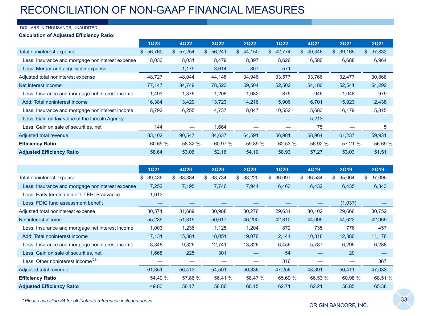 RECONCILIATION OF NON-GAAP FINANCIAL MEASURES DOLLARS IN THOUSANDS, UNAUDITED Calculation of Adjusted Efficiency Ratio: 1Q23 4Q22 3Q22 2Q22 1Q22 4Q21 3Q21 2Q21 Total noninterest expense $ 56,760 $ 57,254 $ 56,241 $ 44,150 $ 42,774 $ 40,346 $ 39,165 $ 37,832 Less: Insurance and mortgage noninterest expense 8,033 8,031 8,479 8,397 8,626 6,580 6,688 6,964 Less: Merger and acquisition expense — 1,179 3,614 807 571 — — — Adjusted total noninterest expense 48,727 48,044 44,148 34,946 33,577 33,766 32,477 30,868 Net interest income 77,147 84,749 78,523 59,504 52,502 54,180 52,541 54,292 Less: Insurance and mortgage net interest income 1,493 1,376 1,208 1,082 875 946 1,048 979 Add: Total noninterest income 16,384 13,429 13,723 14,216 15,906 16,701 15,923 12,438 Less: Insurance and mortgage noninterest income 8,792 6,255 4,737 8,047 10,552 5,683 6,179 5,815 Less: Gain on fair value of the Lincoln Agency — — — — — 5,213 — — Less: Gain on sale of securities, net 144 — 1,664 — — 75 — 5 Adjusted total revenue 83,102 90,547 84,637 64,591 56,981 58,964 61,237 59,931 Efficiency Ratio 60.69 % 58.32 % 60.97 % 59.89 % 62.53 % 56.92 % 57.21 % 56.69 % Adjusted Efficiency Ratio 58.64 53.06 52.16 54.10 58.93 57.27 53.03 51.51 1Q21 4Q20 3Q20 2Q20 1Q20 4Q19 3Q19 2Q19 Total noninterest expense $ 39,436 $ 38,884 $ 38,734 $ 38,220 $ 36,097 $ 36,534 $ 35,064 $ 37,095 Less: Insurance and mortgage noninterest expense 7,252 7,195 7,746 7,944 6,463 6,432 6,435 6,343 Less: Early termination of LT FHLB advance 1,613 — — — — — — — — — — — — Less: FDIC fund assessment benefit — — — — — — (1,037) — Adjusted total noninterest expense 30,571 31,689 30,988 30,276 29,634 30,102 29,666 30,752 Net interest income 55,239 51,819 50,617 46,290 42,810 44,095 44,622 42,969 Less: Insurance and mortgage net interest income 1,003 1,236 1,125 1,204 872 735 776 457 Add: Total noninterest income 17,131 15,381 18,051 19,076 12,144 10,818 12,880 11,176 Less: Insurance and mortgage noninterest income 8,348 9,326 12,741 13,826 6,456 5,787 6,295 6,288 Less: Gain on sale of securities, net 1,668 225 301 — 54 — 20 — Less: Other noninterest income(25) — — — — — 316 — — 367 Adjusted total revenue 61,351 56,413 54,501 50,336 47,256 48,391 50,411 47,033 Efficiency Ratio 54.49 % 57.86 % 56.41 % 58.47 % 65.69 % 66.53 % 60.98 % 68.51 % Adjusted Efficiency Ratio 49.83 56.17 56.86 60.15 62.71 62.21 58.85 65.38 33 ORIGIN BANCORP, INC. _______ * Please see slide 34 for all footnote references included above.