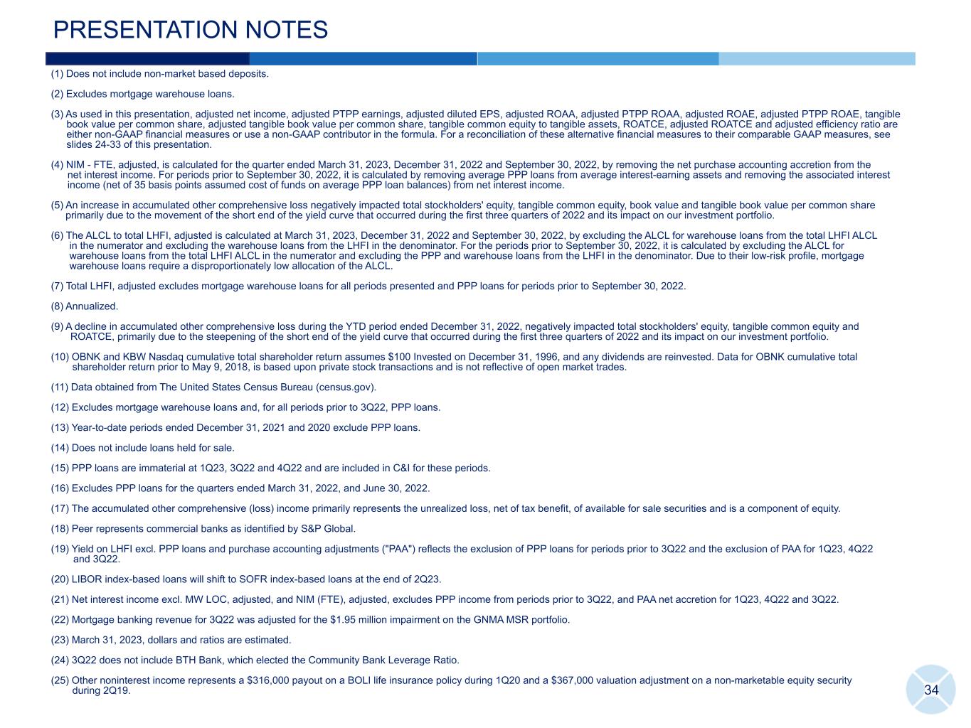 34 PRESENTATION NOTES (1) Does not include non-market based deposits. (2) Excludes mortgage warehouse loans. (3) As used in this presentation, adjusted net income, adjusted PTPP earnings, adjusted diluted EPS, adjusted ROAA, adjusted PTPP ROAA, adjusted ROAE, adjusted PTPP ROAE, tangible book value per common share, adjusted tangible book value per common share, tangible common equity to tangible assets, ROATCE, adjusted ROATCE and adjusted efficiency ratio are either non-GAAP financial measures or use a non-GAAP contributor in the formula. For a reconciliation of these alternative financial measures to their comparable GAAP measures, see slides 24-33 of this presentation. (4) NIM - FTE, adjusted, is calculated for the quarter ended March 31, 2023, December 31, 2022 and September 30, 2022, by removing the net purchase accounting accretion from the net interest income. For periods prior to September 30, 2022, it is calculated by removing average PPP loans from average interest-earning assets and removing the associated interest income (net of 35 basis points assumed cost of funds on average PPP loan balances) from net interest income. (5) An increase in accumulated other comprehensive loss negatively impacted total stockholders' equity, tangible common equity, book value and tangible book value per common share primarily due to the movement of the short end of the yield curve that occurred during the first three quarters of 2022 and its impact on our investment portfolio. (6) The ALCL to total LHFI, adjusted is calculated at March 31, 2023, December 31, 2022 and September 30, 2022, by excluding the ALCL for warehouse loans from the total LHFI ALCL in the numerator and excluding the warehouse loans from the LHFI in the denominator. For the periods prior to September 30, 2022, it is calculated by excluding the ALCL for warehouse loans from the total LHFI ALCL in the numerator and excluding the PPP and warehouse loans from the LHFI in the denominator. Due to their low-risk profile, mortgage warehouse loans require a disproportionately low allocation of the ALCL. (7) Total LHFI, adjusted excludes mortgage warehouse loans for all periods presented and PPP loans for periods prior to September 30, 2022. (8) Annualized. (9) A decline in accumulated other comprehensive loss during the YTD period ended December 31, 2022, negatively impacted total stockholders' equity, tangible common equity and ROATCE, primarily due to the steepening of the short end of the yield curve that occurred during the first three quarters of 2022 and its impact on our investment portfolio. (10) OBNK and KBW Nasdaq cumulative total shareholder return assumes $100 Invested on December 31, 1996, and any dividends are reinvested. Data for OBNK cumulative total shareholder return prior to May 9, 2018, is based upon private stock transactions and is not reflective of open market trades. (11) Data obtained from The United States Census Bureau (census.gov). (12) Excludes mortgage warehouse loans and, for all periods prior to 3Q22, PPP loans. (13) Year-to-date periods ended December 31, 2021 and 2020 exclude PPP loans. (14) Does not include loans held for sale. (15) PPP loans are immaterial at 1Q23, 3Q22 and 4Q22 and are included in C&I for these periods. (16) Excludes PPP loans for the quarters ended March 31, 2022, and June 30, 2022. (17) The accumulated other comprehensive (loss) income primarily represents the unrealized loss, net of tax benefit, of available for sale securities and is a component of equity. (18) Peer represents commercial banks as identified by S&P Global. (19) Yield on LHFI excl. PPP loans and purchase accounting adjustments ("PAA") reflects the exclusion of PPP loans for periods prior to 3Q22 and the exclusion of PAA for 1Q23, 4Q22 and 3Q22. (20) LIBOR index-based loans will shift to SOFR index-based loans at the end of 2Q23. (21) Net interest income excl. MW LOC, adjusted, and NIM (FTE), adjusted, excludes PPP income from periods prior to 3Q22, and PAA net accretion for 1Q23, 4Q22 and 3Q22. (22) Mortgage banking revenue for 3Q22 was adjusted for the $1.95 million impairment on the GNMA MSR portfolio. (23) March 31, 2023, dollars and ratios are estimated. (24) 3Q22 does not include BTH Bank, which elected the Community Bank Leverage Ratio. (25) Other noninterest income represents a $316,000 payout on a BOLI life insurance policy during 1Q20 and a $367,000 valuation adjustment on a non-marketable equity security during 2Q19.