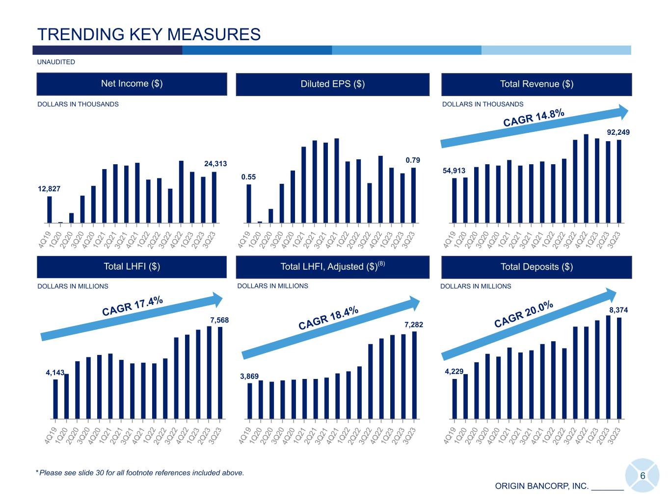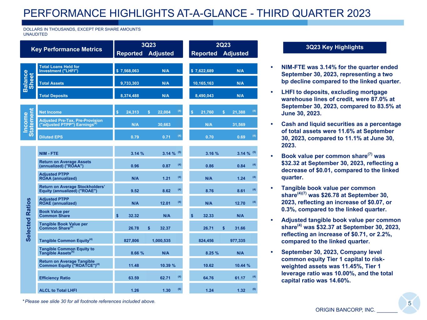 ORIGIN BANCORP, INC. _______ • NIM-FTE was 3.14% for the quarter ended September 30, 2023, representing a two bp decline compared to the linked quarter. • LHFI to deposits, excluding mortgage warehouse lines of credit, were 87.0% at September 30, 2023, compared to 83.5% at June 30, 2023. • Cash and liquid securities as a percentage of total assets were 11.6% at September 30, 2023, compared to 11.1% at June 30, 2023. • Book value per common share(7) was $32.32 at September 30, 2023, reflecting a decrease of $0.01, compared to the linked quarter. • Tangible book value per common share(4)(7) was $26.78 at September 30, 2023, reflecting an increase of $0.07, or 0.3%, compared to the linked quarter. • Adjusted tangible book value per common share(4) was $32.37 at September 30, 2023, reflecting an increase of $0.71, or 2.2%, compared to the linked quarter. • September 30, 2023, Company level common equity Tier 1 capital to risk- weighted assets was 11.45%, Tier 1 leverage ratio was 10.00%, and the total capital ratio was 14.60%. Key Performance Metrics 3Q23 2Q23 Reported Adjusted Reported Adjusted B al an ce Sh ee t Total Loans Held for Investment ("LHFI") $ 7,568,063 N/A $ 7,622,689 N/A Total Assets 9,733,303 N/A 10,165,163 N/A Total Deposits 8,374,488 N/A 8,490,043 N/A In co m e St at em en t Net Income $ 24,313 $ 22,004 (4) $ 21,760 $ 21,388 (4) Adjusted Pre-Tax, Pre-Provision ("adjusted PTPP") Earnings(4) N/A 30,663 N/A 31,569 Diluted EPS 0.79 0.71 (4) 0.70 0.69 (4) Se le ct ed R at io s NIM - FTE 3.14 % 3.14 % (5) 3.16 % 3.14 % (5) Return on Average Assets (annualized) ("ROAA") 0.96 0.87 (4) 0.86 0.84 (4) Adjusted PTPP ROAA (annualized) N/A 1.21 (4) N/A 1.24 (4) Return on Average Stockholders’ Equity (annualized) ("ROAE") 9.52 8.62 (4) 8.76 8.61 (4) Adjusted PTPP ROAE (annualized) N/A 12.01 (4) N/A 12.70 (4) Book Value per Common Share $ 32.32 N/A $ 32.33 N/A Tangible Book Value per Common Share(4) 26.78 $ 32.37 26.71 $ 31.66 Tangible Common Equity(4) 827,806 1,000,535 824,456 977,335 Tangible Common Equity to Tangible Assets(4) 8.66 % N/A 8.25 % N/A Return on Average Tangible Common Equity ("ROATCE")(4) 11.48 10.39 % 10.62 10.44 % Efficiency Ratio 63.59 62.71 (4) 64.76 61.17 (4) ALCL to Total LHFI 1.26 1.30 (6) 1.24 1.32 (6) DOLLARS IN THOUSANDS, EXCEPT PER SHARE AMOUNTS UNAUDITED 5 PERFORMANCE HIGHLIGHTS AT-A-GLANCE - THIRD QUARTER 2023 3Q23 Key Highlights * Please see slide 30 for all footnote references included above.