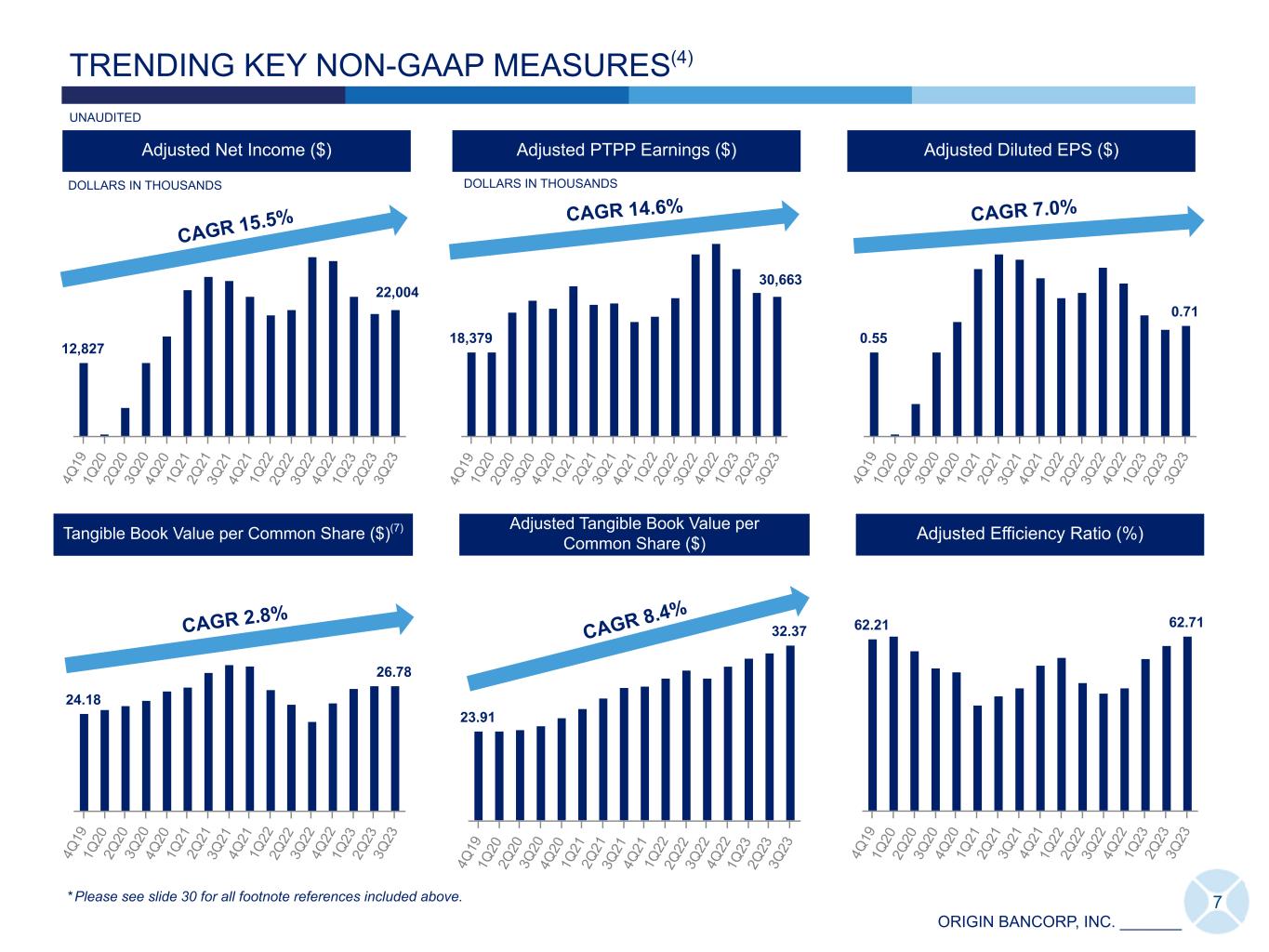 ORIGIN BANCORP, INC. _______ TRENDING KEY MEASURES 54,913 92,249 4Q 19 1Q 20 2Q 20 3Q 20 4Q 20 1Q 21 2Q 21 3Q 21 4Q 21 1Q 22 2Q 22 3Q 22 4Q 22 1Q 23 2Q 23 3Q 23 Total Revenue ($) UNAUDITED Diluted EPS ($)Net Income ($) Total LHFI, Adjusted ($)(8) Total Deposits ($) 0.55 0.79 4Q 19 1Q 20 2Q 20 3Q 20 4Q 20 1Q 21 2Q 21 3Q 21 4Q 21 1Q 22 2Q 22 3Q 22 4Q 22 1Q 23 2Q 23 3Q 23 12,827 4Q 19 1Q 20 2Q 20 3Q 20 4Q 20 1Q 21 2Q 21 3Q 21 4Q 21 1Q 22 2Q 22 3Q 22 4Q 22 1Q 23 2Q 23 3Q 23 4,229 8,374 4Q 19 1Q 20 2Q 20 3Q 20 4Q 20 1Q 21 2Q 21 3Q 21 4Q 21 1Q 22 2Q 22 3Q 22 4Q 22 1Q 23 2Q 23 3Q 23 3,869 7,282 4Q 19 1Q 20 2Q 20 3Q 20 4Q 20 1Q 21 2Q 21 3Q 21 4Q 21 1Q 22 2Q 22 3Q 22 4Q 22 1Q 23 2Q 23 3Q 23 DOLLARS IN THOUSANDS DOLLARS IN THOUSANDS 6 Total LHFI ($) DOLLARS IN MILLIONS 4,143 7,568 4Q 19 1Q 20 2Q 20 3Q 20 4Q 20 1Q 21 2Q 21 3Q 21 4Q 21 1Q 22 2Q 22 3Q 22 4Q 22 1Q 23 2Q 23 3Q 23 DOLLARS IN MILLIONSDOLLARS IN MILLIONS * Please see slide 30 for all footnote references included above. CAGR 14.8% CAGR 17.4% CAGR 18.4% CAGR 20.0% 24,313