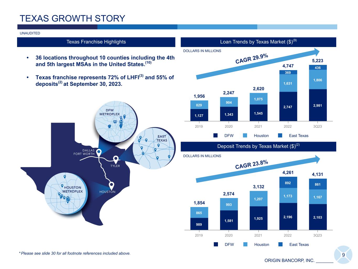 ORIGIN BANCORP, INC. _______ ASSET AND STOCKHOLDERS' EQUITY GROWTH 1997 - 3Q23 DOLLARS IN MILLIONS Total Assets ($) 148 9,733 19 97 19 98 19 99 20 00 20 01 20 02 20 03 20 04 20 05 20 06 20 07 20 08 20 09 20 10 20 11 20 12 20 13 20 14 20 15 20 16 20 17 20 18 20 19 20 20 20 21 20 22 3Q 23 Total Stockholders' Equity ($) 11 999 19 97 19 98 19 99 20 00 20 01 20 02 20 03 20 04 20 05 20 06 20 07 20 08 20 09 20 10 20 11 20 12 20 13 20 14 20 15 20 16 20 17 20 18 20 19 20 20 20 21 20 22 3Q 23 CAGR 17.7% CAGR 19.1% 8 1,785 100 1,297 Origin Bancorp, Inc. Cumulative Return ($) KBW Nasdaq Bank Total Return Index ($) 12 /3 1/ 96 12 /3 1/ 97 12 /3 1/ 98 12 /3 1/ 99 12 /3 1/ 00 12 /3 1/ 01 12 /3 1/ 02 12 /3 1/ 03 12 /3 1/ 04 12 /3 1/ 05 12 /3 1/ 06 12 /3 1/ 07 12 /3 1/ 08 12 /3 1/ 09 12 /3 1/ 10 12 /3 1/ 11 12 /3 1/ 12 12 /3 1/ 13 12 /3 1/ 14 12 /3 1/ 15 12 /3 1/ 16 12 /3 1/ 17 12 /3 1/ 18 12 /3 1/ 19 12 /3 1/ 20 12 /3 1/ 21 12 /3 1/ 22 0 500 1,000 1,500 2,000 2,500 Total Shareholder Return ($)(9) IPO * Please see slide 30 for all footnote references included above. DOLLARS IN MILLIONS UNAUDITED
