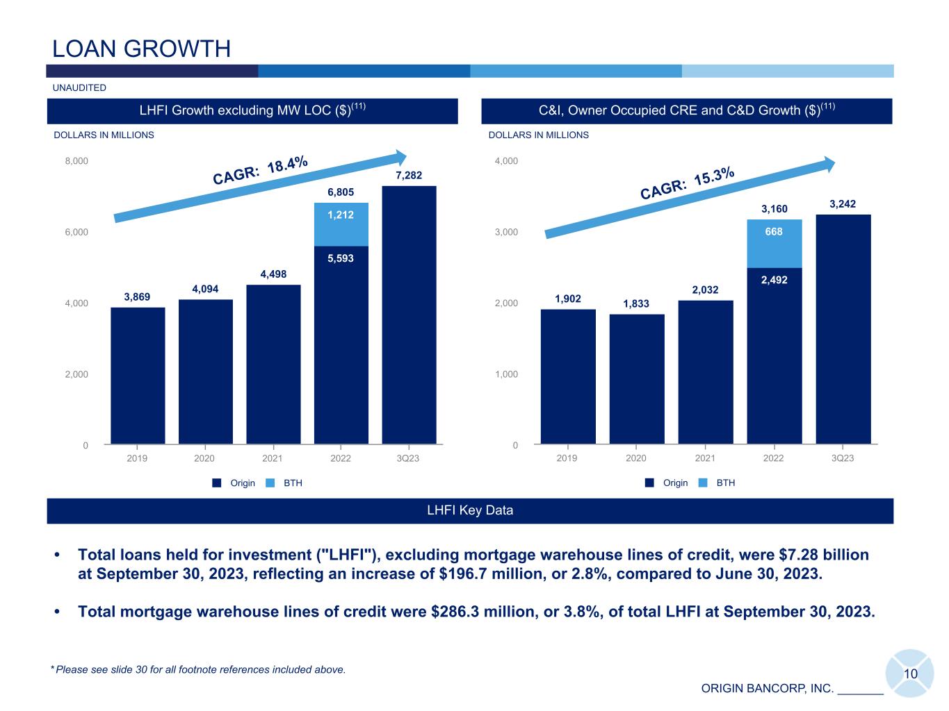 ORIGIN BANCORP, INC. _______ 9 1,956 2,247 2,620 4,747 5,223 1,127 1,343 1,545 2,747 2,981829 904 1,075 1,631 1,806 369 436 DFW Houston East Texas 2019 2020 2021 2022 3Q23 Deposit Trends by Texas Market ($)(2) Loan Trends by Texas Market ($)(3) TEXAS GROWTH STORY Texas Franchise Highlights DOLLARS IN MILLIONS • 36 locations throughout 10 counties including the 4th and 5th largest MSAs in the United States.(10) • Texas franchise represents 72% of LHFI(3) and 55% of deposits(2) at September 30, 2023. 1,854 2,574 3,132 4,261 4,131 989 1,581 1,925 2,196 2,103 865 993 1,207 1,173 1,167 892 861 DFW Houston East Texas 2019 2020 2021 2022 3Q23 CAGR 29.9% CAGR 23.8% * Please see slide 30 for all footnote references included above. DOLLARS IN MILLIONS UNAUDITED