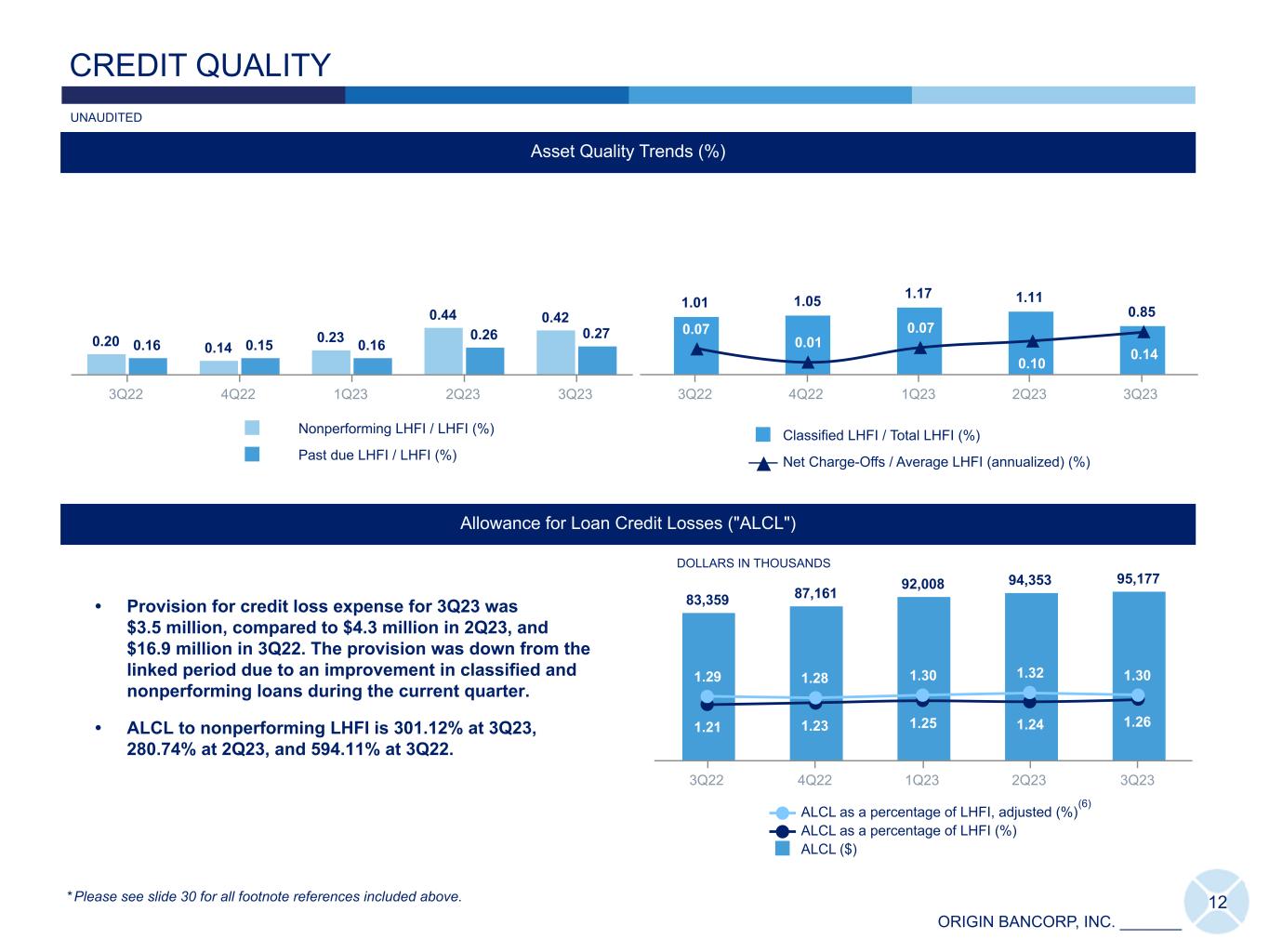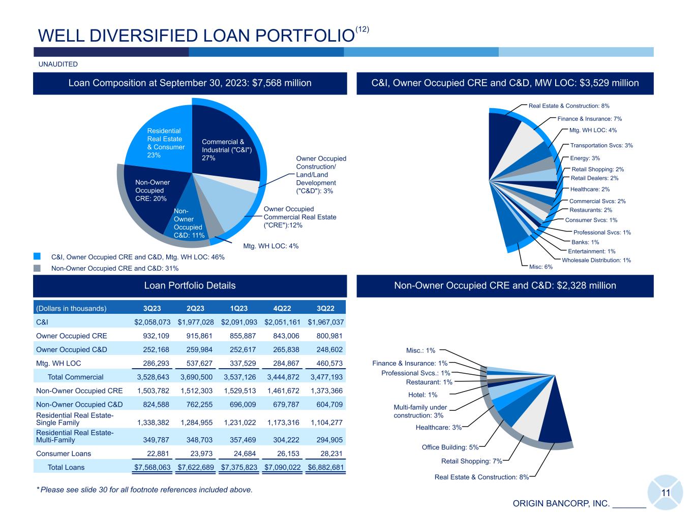 ORIGIN BANCORP, INC. _______ Real Estate & Construction: 8% Retail Shopping: 7% Office Building: 5% Healthcare: 3% Multi-family under construction: 3% Hotel: 1% Restaurant: 1% Professional Svcs.: 1% Finance & Insurance: 1% Misc.: 1% Commercial & Industrial ("C&I") 27% Owner Occupied Construction/ Land/Land Development ("C&D"): 3% Owner Occupied Commercial Real Estate ("CRE"):12% Mtg. WH LOC: 4% Non- Owner Occupied C&D: 11% Non-Owner Occupied CRE: 20% Residential Real Estate & Consumer 23% Real Estate & Construction: 8% Finance & Insurance: 7% Mtg. WH LOC: 4% Transportation Svcs: 3% Energy: 3% Retail Shopping: 2% Retail Dealers: 2% Healthcare: 2% Commercial Svcs: 2% Restaurants: 2% Consumer Svcs: 1% Professional Svcs: 1% Banks: 1% Entertainment: 1% Wholesale Distribution: 1% Misc: 6% 11 WELL DIVERSIFIED LOAN PORTFOLIO (Dollars in thousands) 3Q23 2Q23 1Q23 4Q22 3Q22 C&I $ 2,058,073 $ 1,977,028 $ 2,091,093 $ 2,051,161 $ 1,967,037 Owner Occupied CRE 932,109 915,861 855,887 843,006 800,981 Owner Occupied C&D 252,168 259,984 252,617 265,838 248,602 Mtg. WH LOC 286,293 537,627 337,529 284,867 460,573 Total Commercial 3,528,643 3,690,500 3,537,126 3,444,872 3,477,193 Non-Owner Occupied CRE 1,503,782 1,512,303 1,529,513 1,461,672 1,373,366 Non-Owner Occupied C&D 824,588 762,255 696,009 679,787 604,709 Residential Real Estate- Single Family 1,338,382 1,284,955 1,231,022 1,173,316 1,104,277 Residential Real Estate- Multi-Family 349,787 348,703 357,469 304,222 294,905 Consumer Loans 22,881 23,973 24,684 26,153 28,231 Total Loans $ 7,568,063 $ 7,622,689 $ 7,375,823 $ 7,090,022 $ 6,882,681 Loan Portfolio Details Non-Owner Occupied CRE and C&D: $2,328 million C&I, Owner Occupied CRE and C&D, MW LOC: $3,529 million C&I, Owner Occupied CRE and C&D, Mtg. WH LOC: 46% Non-Owner Occupied CRE and C&D: 31% Loan Composition at September 30, 2023: $7,568 million * Please see slide 30 for all footnote references included above. UNAUDITED (12)