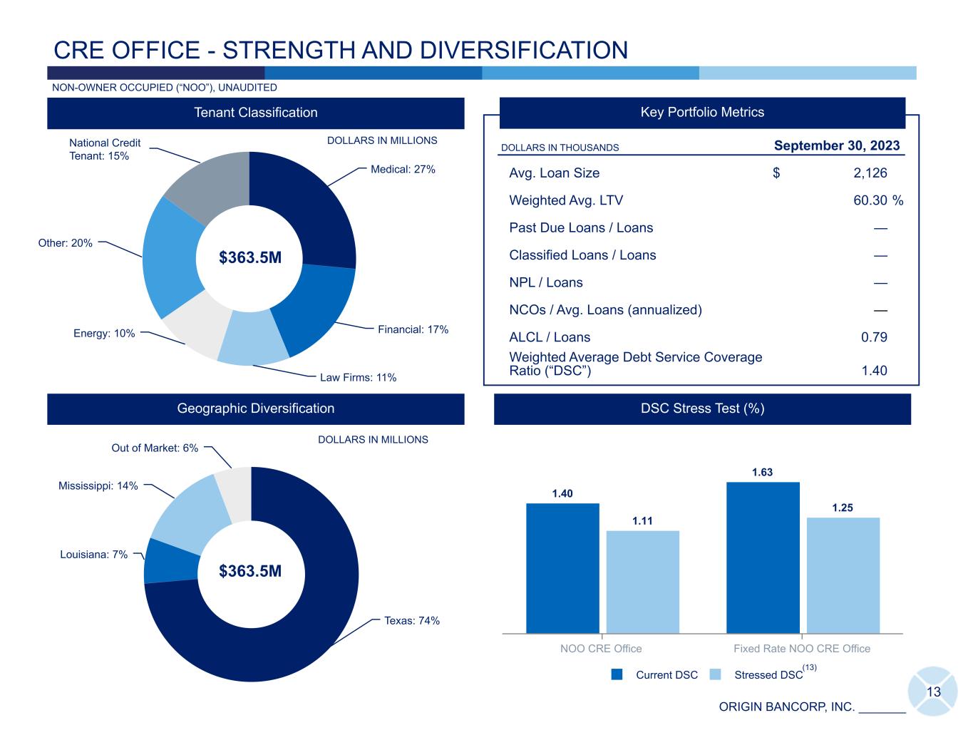 ORIGIN BANCORP, INC. _______ 1.01 1.05 1.17 1.11 0.85 Classified LHFI / Total LHFI (%) Net Charge-Offs / Average LHFI (annualized) (%) 3Q22 4Q22 1Q23 2Q23 3Q23 0.07 0.01 0.07 0.10 0.14 0.20 0.14 0.23 0.44 0.42 0.16 0.15 0.16 0.26 0.27 Nonperforming LHFI / LHFI (%) Past due LHFI / LHFI (%) 3Q22 4Q22 1Q23 2Q23 3Q23 12 CREDIT QUALITY Asset Quality Trends (%) Allowance for Loan Credit Losses ("ALCL") 83,359 87,161 92,008 94,353 95,177 1.21 1.23 1.25 1.24 1.26 1.29 1.28 1.30 1.32 1.30 ALCL as a percentage of LHFI, adjusted (%) ALCL as a percentage of LHFI (%) ALCL ($) 3Q22 4Q22 1Q23 2Q23 3Q23 • Provision for credit loss expense for 3Q23 was $3.5 million, compared to $4.3 million in 2Q23, and $16.9 million in 3Q22. The provision was down from the linked period due to an improvement in classified and nonperforming loans during the current quarter. • ALCL to nonperforming LHFI is 301.12% at 3Q23, 280.74% at 2Q23, and 594.11% at 3Q22. DOLLARS IN THOUSANDS (6) * Please see slide 30 for all footnote references included above. UNAUDITED