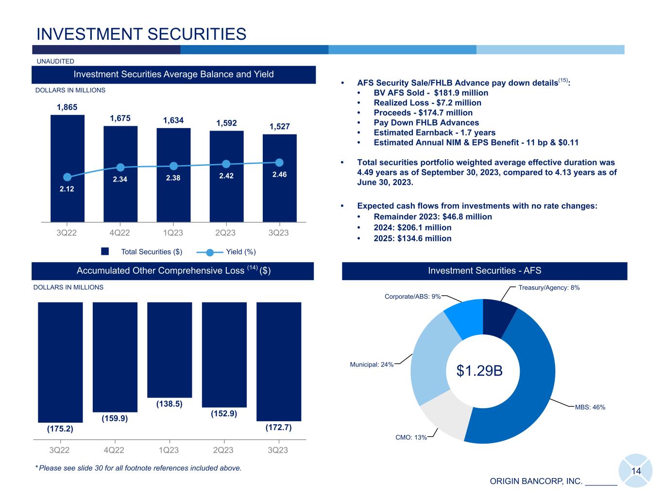 ORIGIN BANCORP, INC. _______ Treasury/Agency: 8% MBS: 46% CMO: 13% Municipal: 24% Corporate/ABS: 9% 1,865 1,675 1,634 1,592 1,527 2.12 2.34 2.38 2.42 2.46 Total Securities ($) Yield (%) 3Q22 4Q22 1Q23 2Q23 3Q23 Investment Securities Average Balance and Yield INVESTMENT SECURITIES DOLLARS IN MILLIONS • AFS Security Sale/FHLB Advance pay down details(15): • BV AFS Sold - $181.9 million • Realized Loss - $7.2 million • Proceeds - $174.7 million • Pay Down FHLB Advances • Estimated Earnback - 1.7 years • Estimated Annual NIM & EPS Benefit - 11 bp & $0.11 • Total securities portfolio weighted average effective duration was 4.49 years as of September 30, 2023, compared to 4.13 years as of June 30, 2023. • Expected cash flows from investments with no rate changes: • Remainder 2023: $46.8 million • 2024: $206.1 million • 2025: $134.6 million 14 (175.2) (159.9) (138.5) (152.9) (172.7) 3Q22 4Q22 1Q23 2Q23 3Q23 Accumulated Other Comprehensive Loss (14) ($) Investment Securities - AFS * Please see slide 30 for all footnote references included above. $1.29B DOLLARS IN MILLIONS UNAUDITED